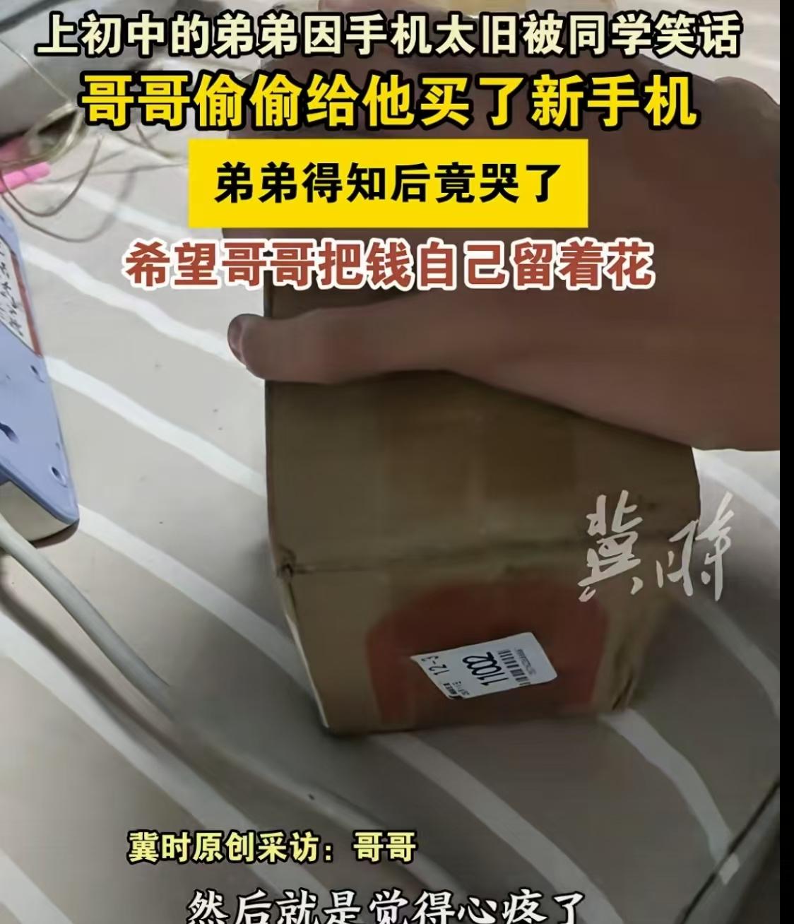 上初中的弟弟因为手机太旧被同学嘲笑,哥哥知道后偷偷给他买了个新手机!可弟弟收到后的反应,却让哥哥意想不到!哥哥:“本来以为他收到后会开心的大叫,没想到他会哭……”网友:现在孩子攀比心很重,这弟弟真乖,好懂事! 弟弟因为手机又旧又卡,在学校里被同学们好一顿嘲笑。可这孩子挺懂事,回家跟家人念叨了两句,就没再提过换手机的事儿,更没缠着爸妈给他买新的。 但哥哥听了这事儿,心里很感慨。想当年自己跟弟弟这么大的时候,不也因为手机破旧被同学笑话过嘛,那时候心里头多渴望能有个像样的手机啊。 所以哥哥下定决心,不让弟弟再受自己当年那份委屈。他悄悄地用自己打工辛苦攒下的钱,给弟弟买了个新手机,打算给弟弟一个惊喜。 等弟弟放学回到家,哥哥把新手机递到了他手里。哥哥心里头琢磨着,弟弟这下不得乐坏了。 可没想到,弟弟接过手机,却哭了起来! 哥哥一下子愣住了,忙问弟弟:“你这是哭啥呀?” 弟弟抹着眼泪说:“哥,你赚钱那么不容易,这手机太贵了,你还是退了吧,把钱留着自己用。我这旧手机虽然慢点儿,但还能凑合着用呢。” 哥哥听了这话,心里头既感动又欣慰,觉得弟弟真是懂事得让人心疼。他赶紧劝弟弟收下手机,还跟弟弟说:“这东西你配得上!” 此事引发了热议,有网友说,我弟17岁想自己打暑假工买一个好手机,但是他年龄太小很多都不要他,他也不开口问我要手机,也不问爸妈要,最后我自己花了一个月工资给他买了一个,我也觉得我弟是配的上一个好手机的! 也有网友说,弟弟懂事,哥哥给力,这个手机弟弟能记哥哥一辈子!这就是兄弟情! 还有网友说,弟弟配得上新手机,哥哥配得上好榜样!兄友弟恭,这家以后肯定兴旺! 在这个物质至上、攀比成风的社会里,弟弟的这份纯真与懂事显得尤为难能可贵。 他没有被虚荣心冲昏头脑,没有因为同学的嘲笑就盲目追求物质享受,反而懂得体谅哥哥的辛苦,珍惜每一分来之不易的钱。这种难能可贵的品质,恰恰是当下许多孩子所缺失的。 我们常常看到,有些孩子因为一点小小的虚荣心,就向父母提出各种无理要求,甚至不惜与同学攀比。 而弟弟的举动,无疑给我们敲响了警钟:真正的成长,不在于你拥有多少物质财富,而在于你能否保持一颗谦逊、感恩和懂得珍惜的心。 哥哥更是用实际行动诠释了什么是长兄如父的责任与担当。他没有忽视弟弟的困扰,而是用自己的努力为弟弟撑起了一片天,让弟弟感受到了浓浓的亲情与温暖。 我们常常看到,有些兄弟姐妹之间因为一点小事就争得面红耳赤,甚至反目成仇。而这对兄弟的举动,无疑给我们树立了榜样! 哥哥的付出与弟弟的懂事,共同谱写了一曲温馨动人的亲情赞歌!