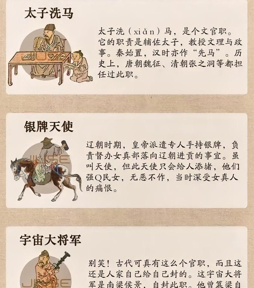 "飞龙使",名字听着霸气,实则是皇家马场场长。每天的工作内容是:"陛下,您的马洗好了!"这活儿要是让孙悟空知道,怕是要笑出声:"俺老孙的弼马温找到同行了!" 而"太子洗马"这个岗位,居然是给太子"洗脑"的!不过别误会,人家洗的是知识,是太子的首席家教,相当于今天的清华教授给王储一对一辅导。魏征就干过这活儿,难怪后来敢跟唐太宗顶嘴,毕竟曾经是"老师的老师"! 要说古代最忙的“公务员”,"同卿"绝对榜上有名!这位老哥身兼三职:交通部长+皇家车队队长+皇帝专属司机。每逢重大活动,还得亲自驾车载着皇帝巡游,堪称古代版的"滴滴皇家专车"。 相比之下,"大长秋"就体面多了——后宫总管,相当于紫禁城物业总经理。曹操的祖父曹腾就干过这活儿,可见这岗位有多重要。不过友情提示:想应聘得先做个手术... 最让人羡慕的是"宇宙大将军",不用考试不用面试,自己封自己就行!建议现代HR学习一下这个操作,保证招聘效率翻倍。不过后果自负哈,毕竟上一个这么干的人,坟头草都两米高了!
