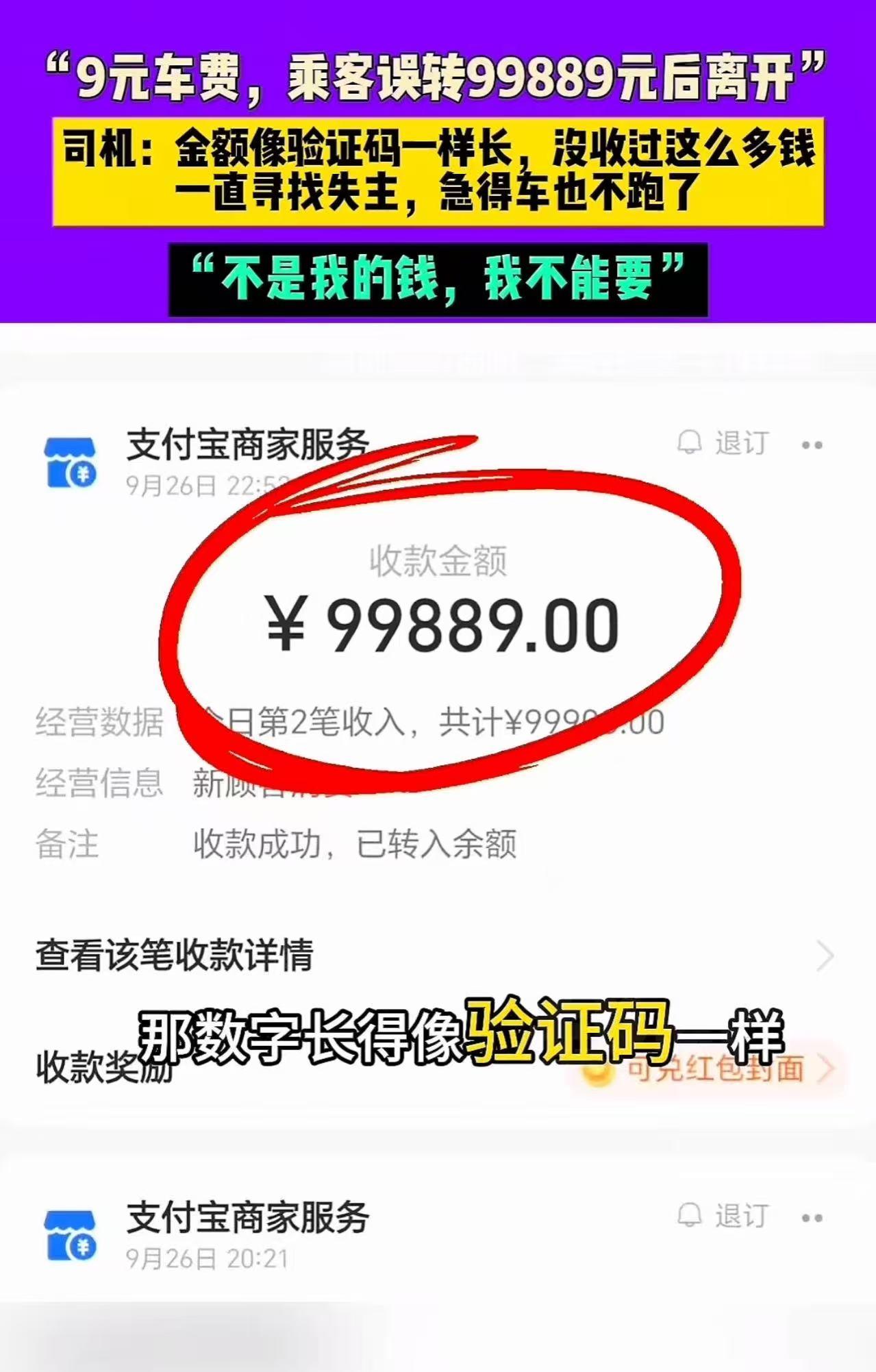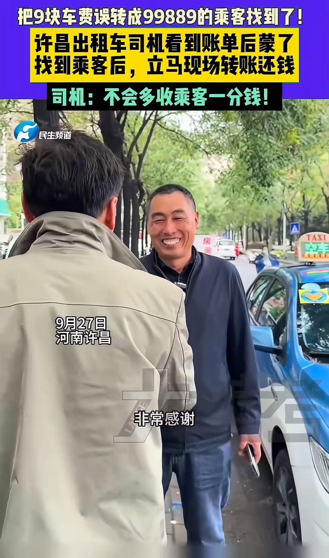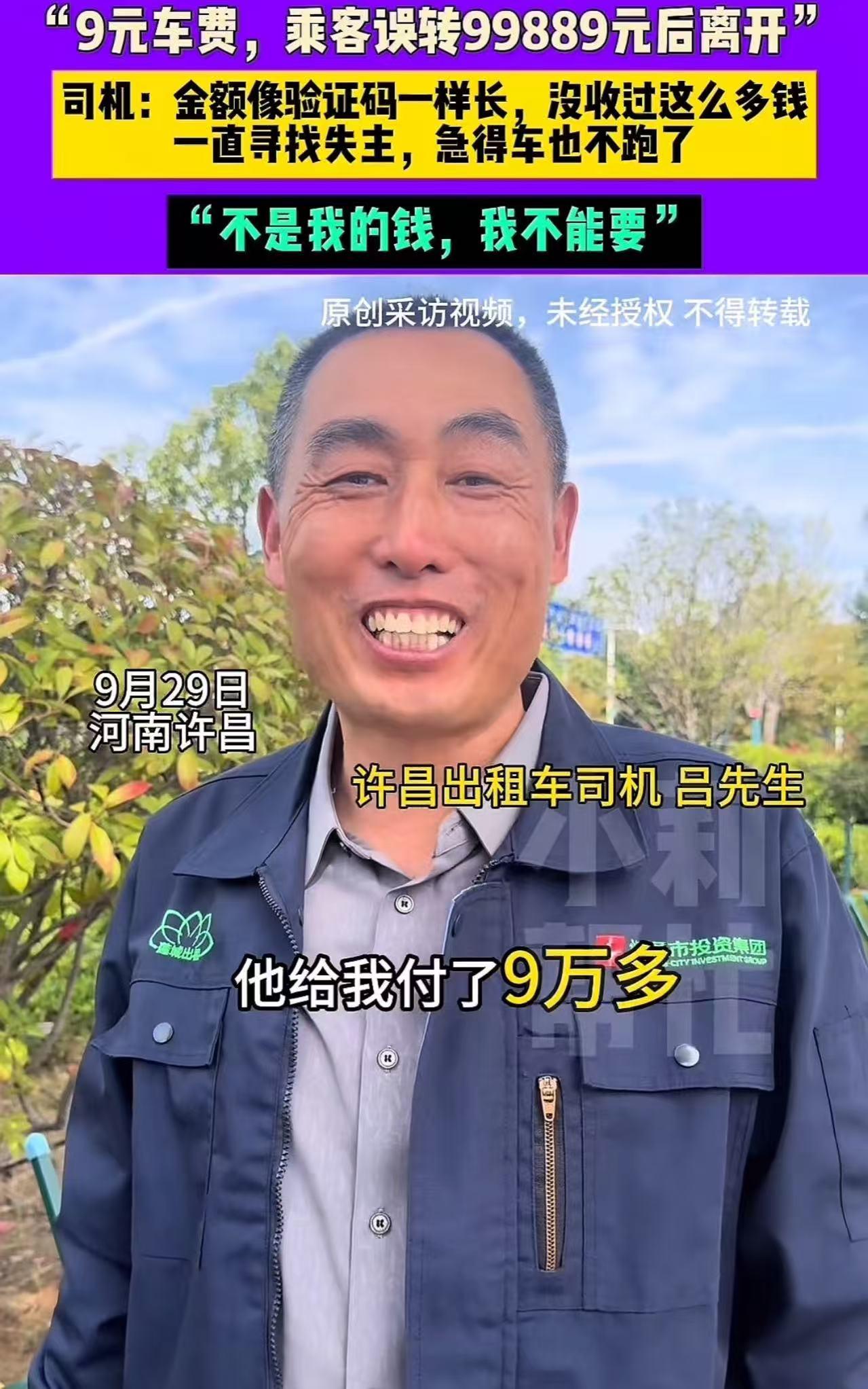 “这个出租车司机火了!”河南许昌,乘客误将9元车费转成99889元,出租车司机发现这笔“天降横财”以后,毅然而然地做出一个感人的举动!网友:羡慕他打车能遇到这样的司机,更羡慕他的余额,我犯不了这样的错。 吕师傅是一位兢兢业业的出租车司机,他有个雷打不动的习惯,就是每天清晨醒来,第一件事就是查看手机里的收款账单,了解昨天赚了多少钱。 可是,这天清晨,当吕师傅像往常一样看向手机屏幕时,瞬间被上面的数字惊得瞪大了眼睛——昨天一天的收入竟高达9万多! 这巨额数字,让吕师傅瞬间清醒过来。他心里明白,这肯定是哪位乘客不小心转错钱了。 他赶忙仔细翻看每一笔转账记录,很快发现,问题出在昨晚10点多的一笔交易上,有位乘客竟然转了99889元! 吕师傅对这笔订单还有些印象,当时一位男乘客喝得有些微醺,在路边招手拦下了他的车。由于目的地不远,车费只有9块钱。 吕师傅当时没太在意收款情况,手机喇叭声音也调得很小,以至于根本没听到这巨额转账的提示音。 但是面对这从天而降的9万多块钱,吕师傅没有丝毫私吞的念头。他心想,乘客发现钱转错后,肯定急得像热锅上的蚂蚁。 可乘客既不知道自己的车牌号,也没留下其他联系方式,根本无法联系上他。 心急如焚的吕师傅顾不上继续出车赚钱,立刻主动前往派出所报案,寻求民警的帮助。在民警的热心协助下,经过一番努力,终于联系上了那位男乘客。 男乘客紧紧握着吕师傅的手,激动得声音都有些颤抖:“太感谢您了!我当时喝多了,还耽误您做生意,专门跑这一趟给我送钱……” 吕师傅憨厚地笑了笑,摆摆手说:“没啥,这是我身为司机应该做的,不该多收乘客一分钱,诚信做人、踏实做事,心里才踏实!” 此事引发热议,有网友说,有时候穷也挺好的,我 9后面多输一个0,就提示余额不足了! 也有网友说,这肯定是把支付密 码当付款金额了,哈哈哈,因为我也按错国! 还有网友说,可惜有个司机却因为1010块,逼死了一个19岁的孩子! 9万多块钱,对于许多人来说,或许是一笔可以改变生活的巨款,但吕师傅却毫不犹豫地选择了归还。 他的行为,不仅仅是对道德底线的坚守,更是对人性中善良与诚信的深刻诠释。 他用自己的行动告诉我们,在物欲横流的世界里,依然有人能够坚守内心的纯净,不被金钱所迷惑,不被利益所驱使。 吕师傅,你是平凡生活中的英雄,是诚信的守护者。你的故事,让我们看到了人性的美好,也让我们相信,在这个世界上,善良与诚信永远不会过时!