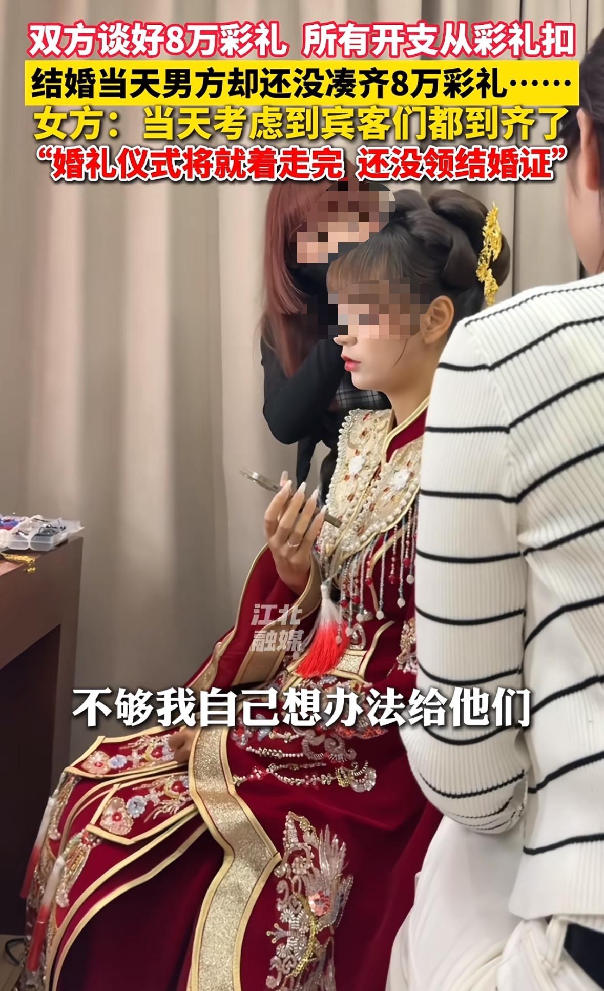 遇上这样的婚姻你还继续吗? 重庆一对新人结婚,双方谈好的彩礼是8万块 结果结婚当天宾客都到齐了,男方却还没凑足彩礼钱 女方是远嫁,亲戚所有的路费和一些杂费都是自己在出 而男方这边只需要拿出来彩礼就行 本来女方觉得自己结婚不容易 等结完婚,除掉彩礼钱,剩下的退回,现在遇上这一出 为考虑自己的脸面,最后将就把婚礼办完 但最后纠结是否去不去办结婚证 你们觉得这样的婚姻还要继续吗?