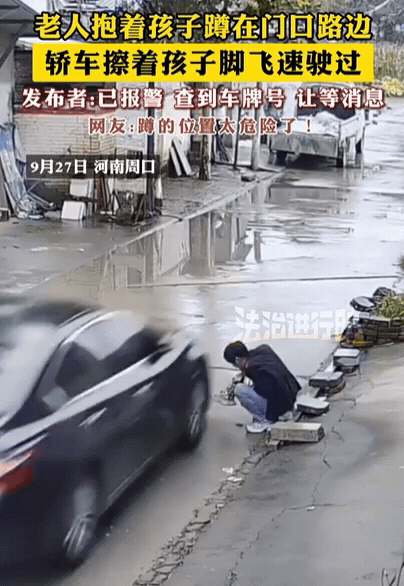 “心真大!”河南一老人抱孩子蹲路边,结果,一辆小车擦着孩子脚飞驰而过,本以为车