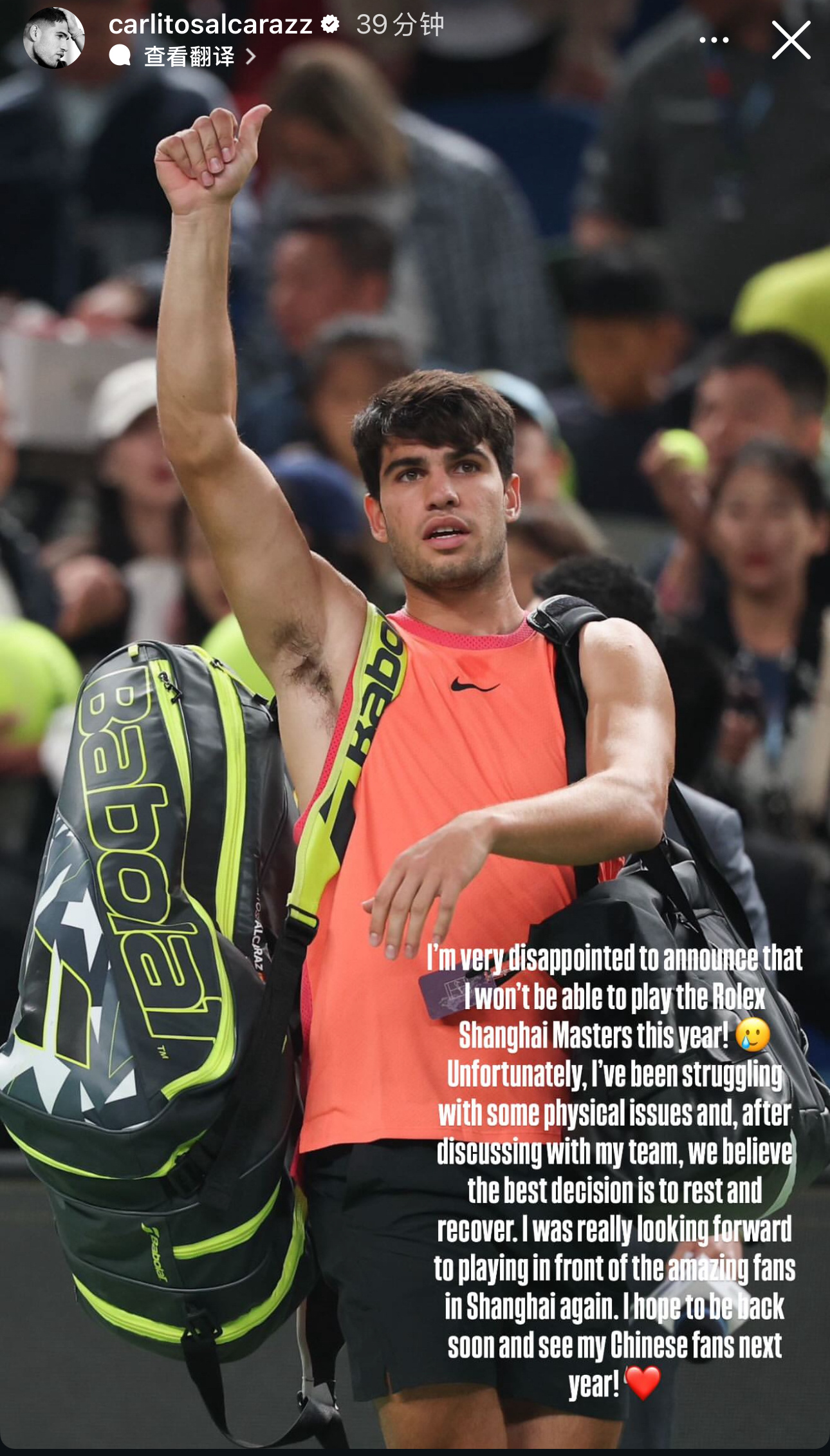 “我很失望地宣布今年不能参加上海大师赛了!非常不走运,我最近有些身体上的问题,在和团队讨论协商之后,我们觉得最好的选择就是休息和康复。