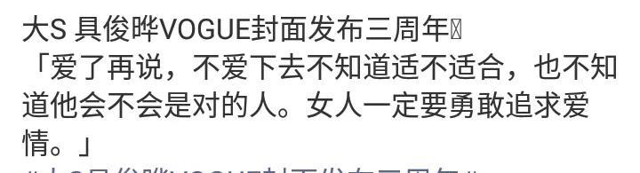 大S具俊晔VOGUE封面发布三周年,证明了大S爱的人是谁? 大S和具俊晔在一起,这就是爱自己,爱对方的最好证明。 正所谓一个人爱谁,她就会跟谁在一起。 反之,一个人不爱时,她就会离开这个人。 大S婚前婚后,越来越清醒,她知道自己究竟爱谁! 勇敢爱一个人,是大S的梦想所在,也是 具俊晔的积极主动表达。 因为大S具俊晔真正爱对方的时候,他们已经不是普普通通的人,他们的爱情境界更上一层楼! #秋日生活打卡季# #万能生活指南#