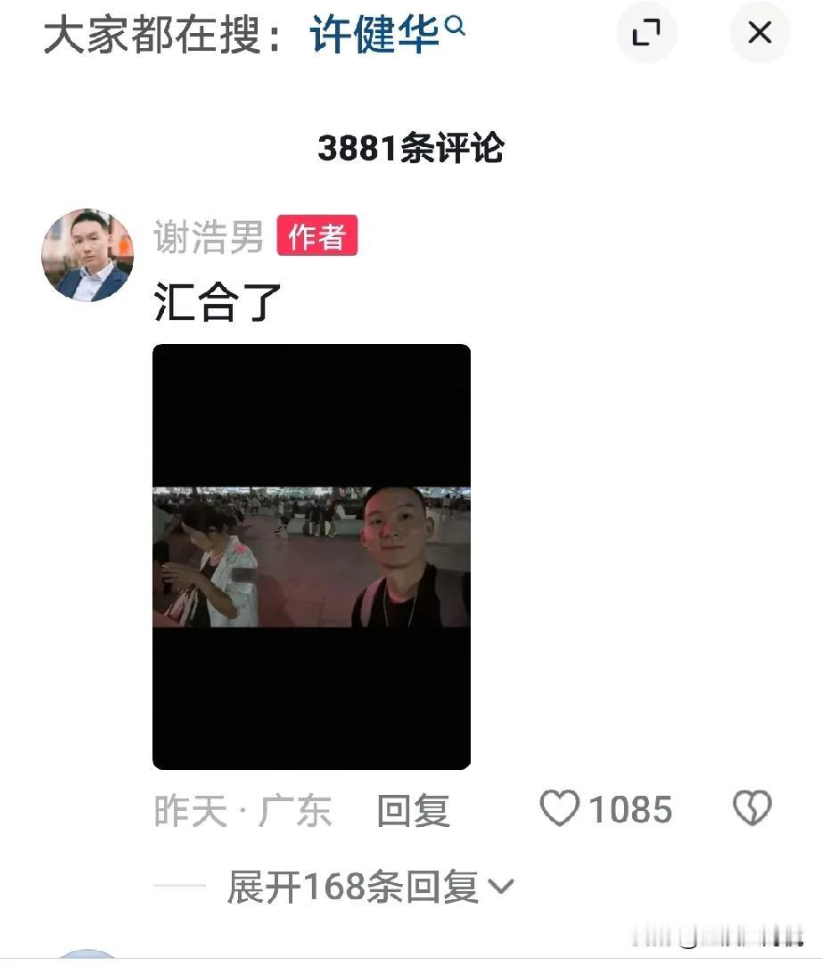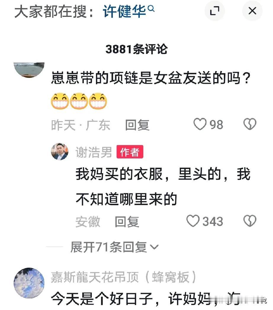 原来谢浩男昨天就已经到达深圳了, 这次不是谢岳去接机的, 而且许建华,大妹海军一起去接的, 然后谢浩男就在自的评论区给大家报平安,说汇合了, 然而他又回复项链的问题,他说是他的妈妈给买的衣服,自带的,他自己也不知道怎么回事, 说真的,这次谢浩男回来我以为又是谢岳抢着去接,没想到这次是许建华