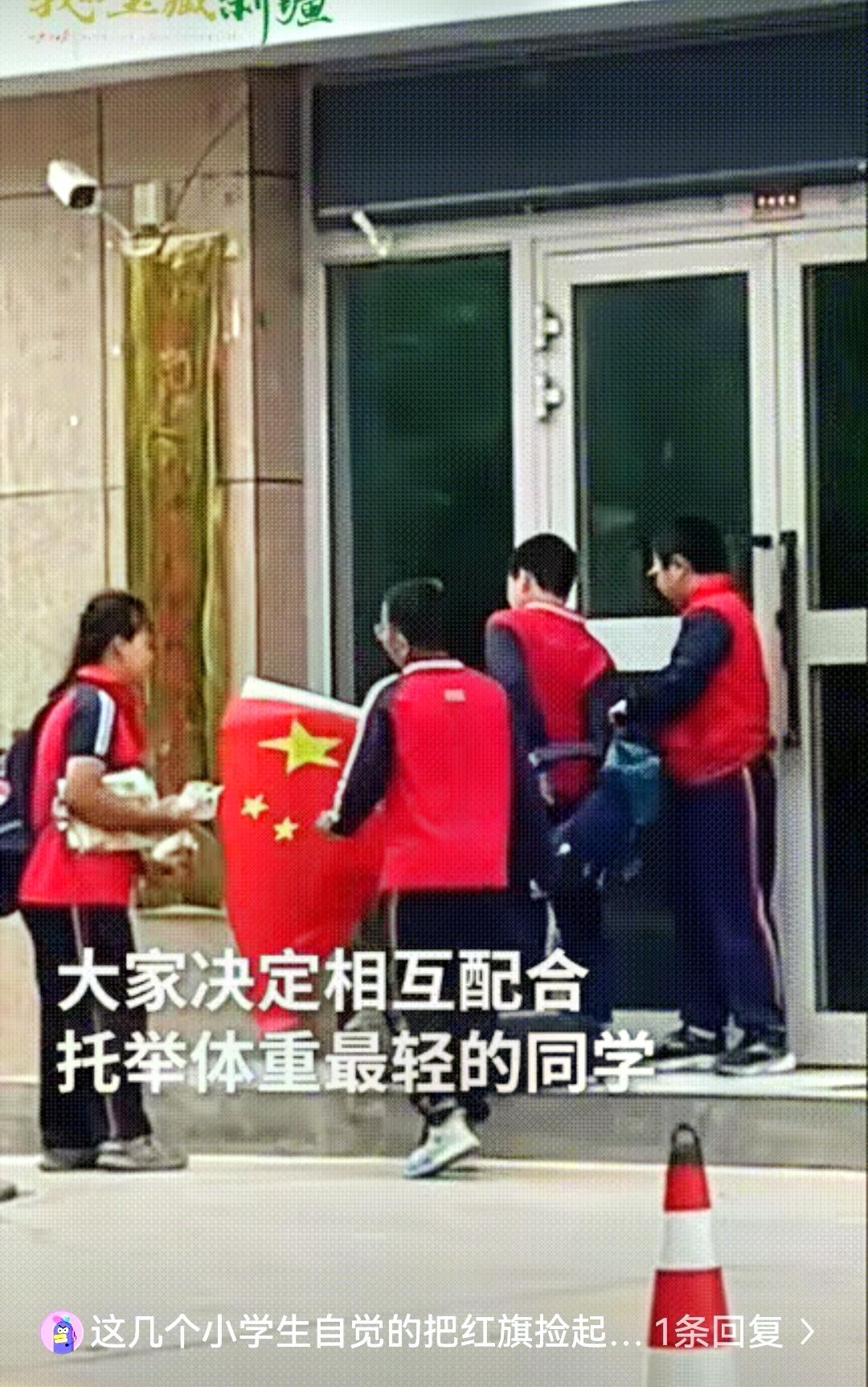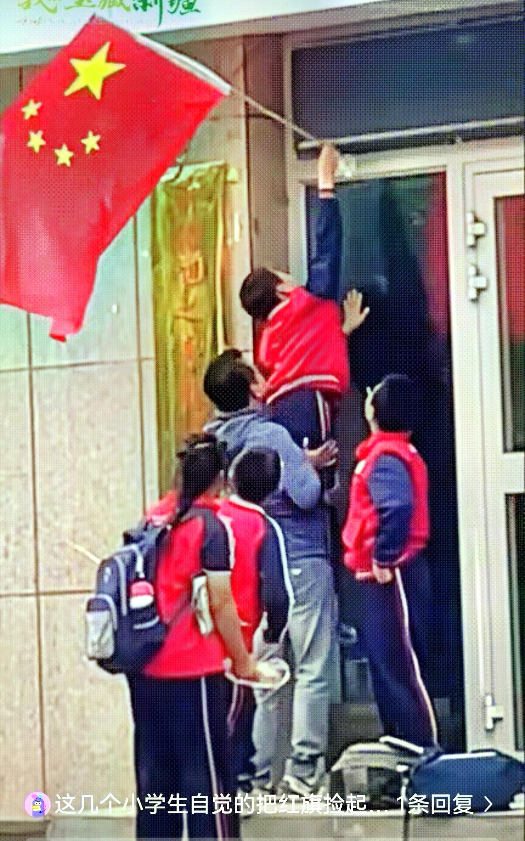 库尔勒这一幕火了!4个娃挂国旗急得冒汗,大哥一个动作比讲100句都顶用 新疆库尔勒街头,一面国旗掉在地上,刚放学的4个小学生撞见了,立马蹲下去捡,跟护宝贝似的。 几个小家伙凑成一团想挂回去,个子最高的踮着脚跳,手离旗杆顶还差一大截,急得直跺脚;商量半天,把国旗塞给最瘦小的同学,小嗓子亮堂堂:“看你的!我们抬你!”可小胳膊细得跟豆芽似的,攒着力气举了好几次,全白费,汗珠子顺着脸蛋往下淌。 这时候路过个大哥,没直接上手挂,反倒弯腰抱起拿旗的娃。就这么轻轻一托,孩子的手终于够着旗杆,稳稳把国旗插好了。大哥放下娃,瞅着小家伙们仰着头盯国旗的傻样,开心笑了笑,转身就走了。 其实哪用说大道理?娃不懂“爱国”是啥大词,却知道国旗不能脏;大哥没想着当榜样,却没打断娃们的较真。这一捡一托里藏的,比啥说教都管用——靠谱的事,从来都是这么悄悄递下去的。