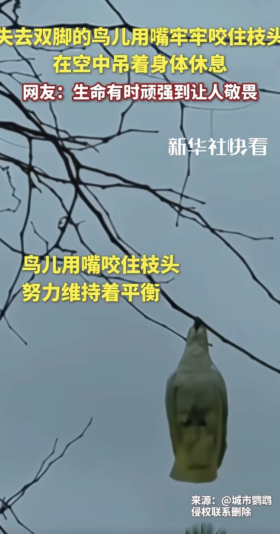 这只小鸟让人看得心疼又敬佩!它失去了双脚,却用嘴死死咬住树枝,把自己吊在半空中休