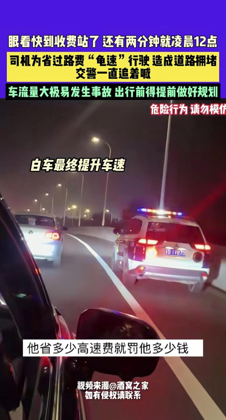 这司机算盘打得真响!眼看快到收费站,为了省零点后的过路费,居然在高速上“龟速”行驶,结果造成后方道路拥堵。 交警追着喊话提醒,车流量这么大,极易引发追尾事故。最后司机虽然提速了,但这种行为既危险又自私。 省那点过路费,万一出事代价更大。真该像网友说的:省多少高速费就罚他多少钱!开车上路,安全永远要放在第一位。