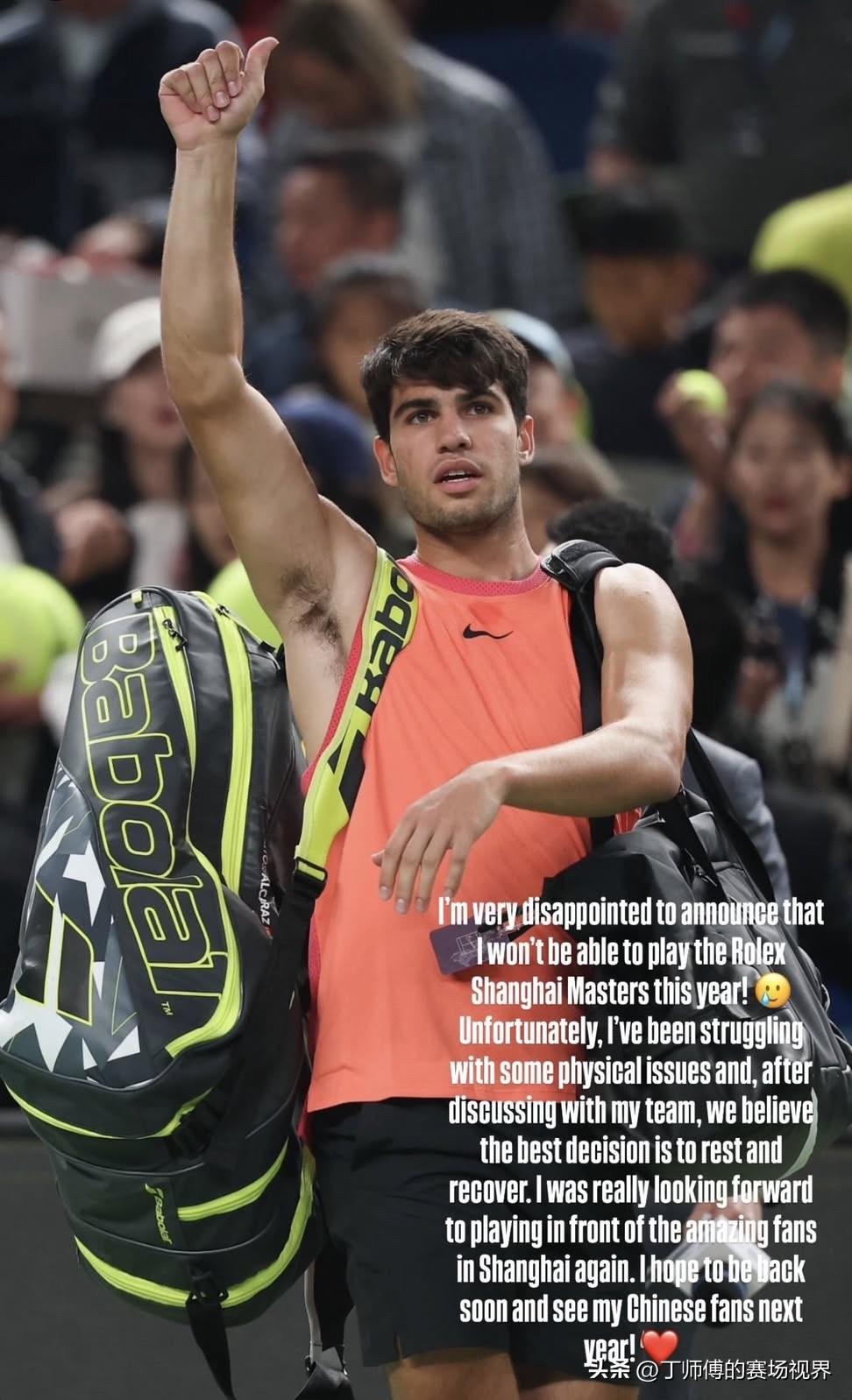 阿尔卡拉斯宣布退出上海大师赛:“我很遗憾地宣布,今年我将错过劳力士上海大师赛!实在太糟糕了,我一直在与一些身体问题作斗争,经过我们团队的商量后,我们一致决定最好的选择是休息和恢复。我真的很期待再有机会在上海的球迷面前打球,希望明年我能够回来这里,和我的中国球迷见面!” 阿尔卡拉斯刚刚夺得东京赛冠军,但因脚部伤势影响,过程一波三折,大家觉得他是真的因为伤病影响还是他不喜欢中国呢?