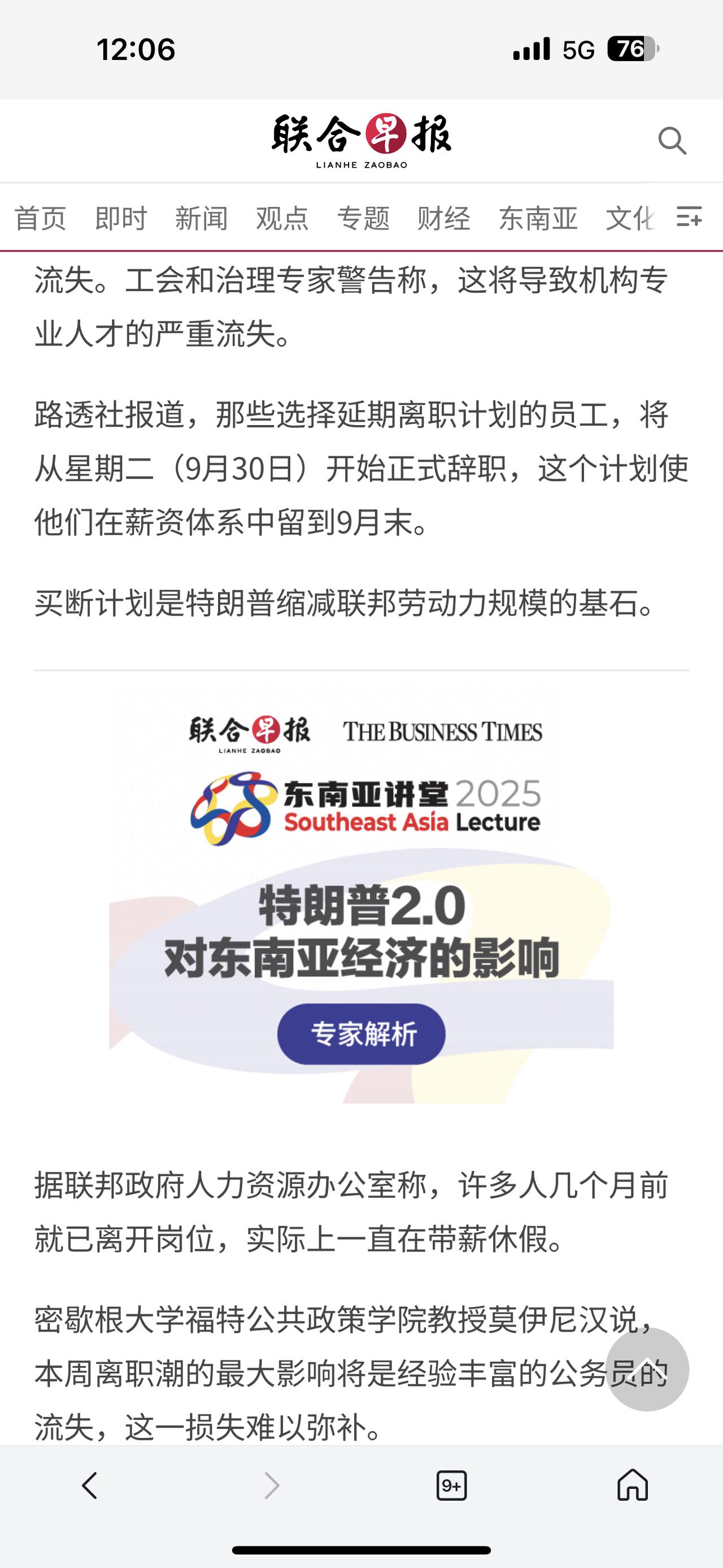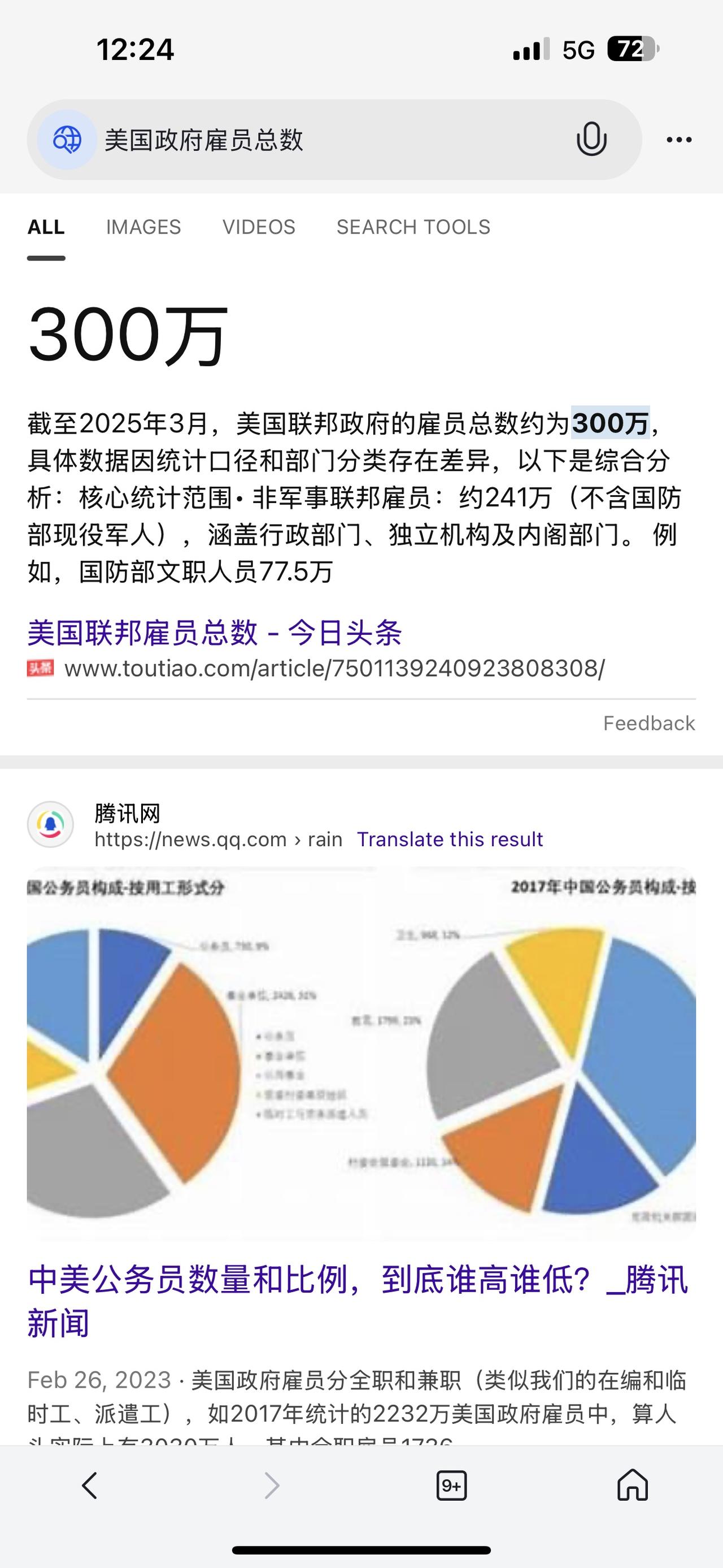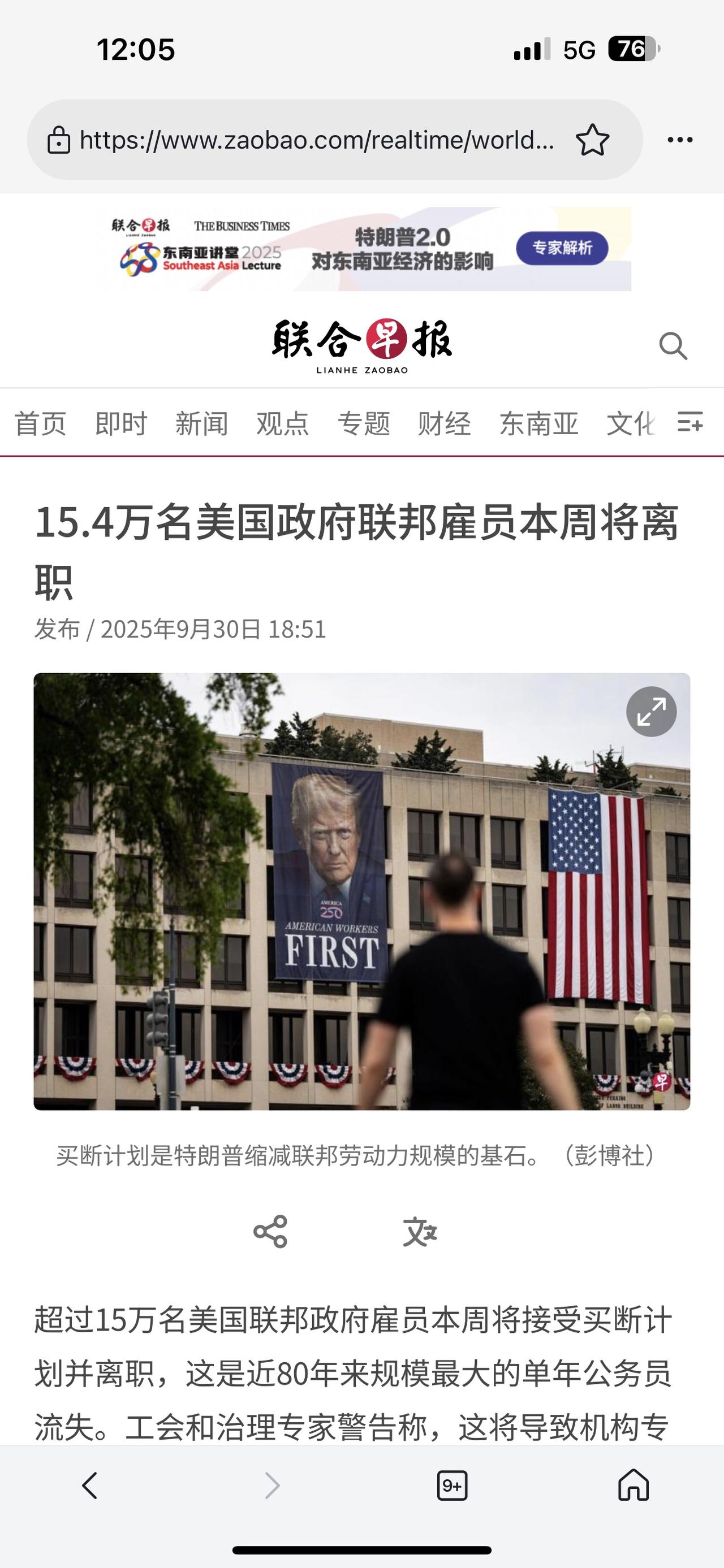 美国大规模裁撤政府雇员:15.4万政府雇员本周将离职! (欢迎关注点赞支持) 路透社2025-9-30报道:那些(15.4万人)选择延期离职计划的员工,将从星期二(9月30日)开始正式辞职,这个计划使他们在薪资体系中留到9月末。买断计划是特朗普缩减联邦劳动力规模的基石。 观察分析:美国劳工统计2022年统计数据,美国由政府支付薪水的雇员总数约1963.1万人,这包含了军人、教师、医务人员、清洁工、消防等。其中,由联邦政府支付薪水的雇员约300万,兼职雇员约940万(类似临时工、派遣工)。 特朗普上台后,组建了政府效率部,准备一共裁撤约50-100万个专职岗位,以降低公共财政预算压力,把更多的资金投入到教育、科研当中。截至目前,已经裁撤了数十个政府部门、约20万政府专职岗位! 按照美国劳工部公布的数据,算上本次裁撤的15.4万岗位和部门,每年节约300亿美元左右的财政支出!