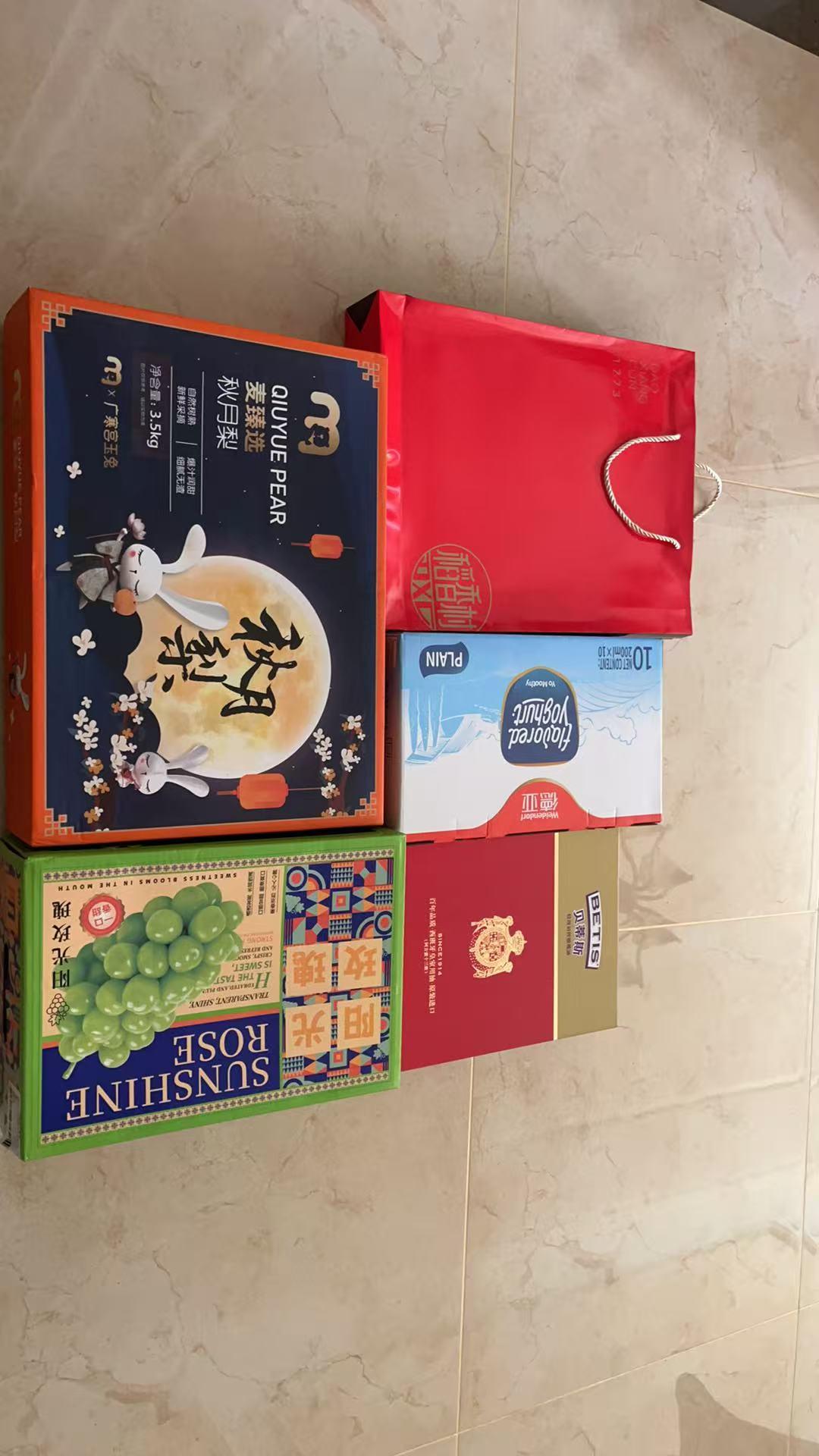 这是我单位发的双节福利:两箱水果、一盒月饼、一箱酸奶、一瓶橄榄油。都不好意思拿出