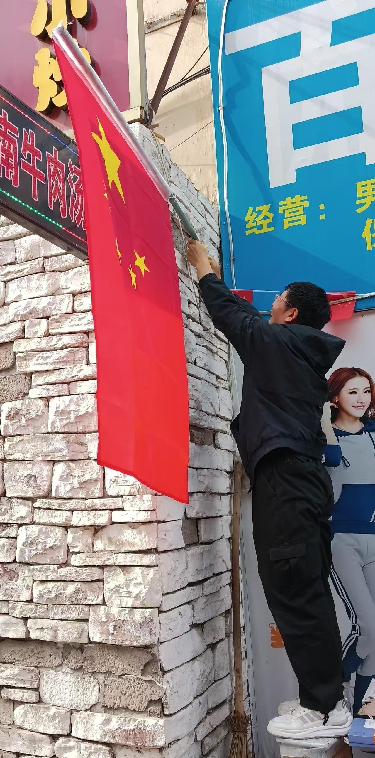 位于乌鲁木齐市天津南路的门面房商户“百姓服饰”悬挂的国旗,是用一根湿的榆木树枝悬挂的,榆木树枝风干后就变弯了,风吹国旗缠绕,悬挂的国旗咋看咋别扭。 为此,我找了半截竹竿,但竹竿又太粗,没有办法插到钢管里,“百姓服饰”给我找来绳子,我将竹竿用绳子在小钢管上系了三道,才将国旗竿固定住。