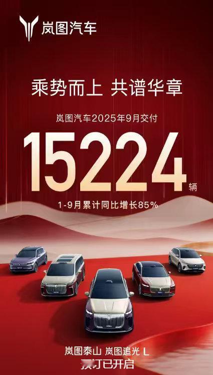 十一假期第一天,我一边开车一边感慨,现在路上的新能源汽车是越来越多了。 停车的时候随手其他了一下,发现岚图汽车9月战报已经发布:月交付量15224辆,同比增长52%。 这已经是岚图连续7个月销量过万,并且实现了八连涨。 1-9月份岚图累计交付量已经达到96992辆,同比大增85%。 要知道,岚图的车可并不便宜,这让这份成绩单显得更有含金量。 目前岚图的销量大部分是由岚图梦想家贡献,它的2026款新车上市18小时订单就破万。 与此同时,岚图泰山、岚图追光L也已经在26日开启预定,这三款车,都提供了800V高压架构、5C超快充、华为乾崑ADS 4、鸿蒙座舱5等核心技术。 不得不说,岚图很懂现在的高端用户,抓住了智能化、超快充等核心要素。 这三款车,是同样的产品思路;2026款岚图梦想家已经火了,我这个老款车车主实名羡慕,那么,即将上市的岚图泰山、岚图追光L大概率也要起飞了。 所以,10月份的岚图汽车,是不是可以冲击一下月销两万呢?岚图汽车9月交付15224辆 岚图汽车月交付实现8连涨