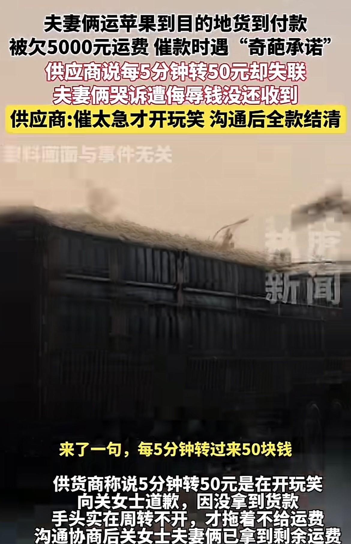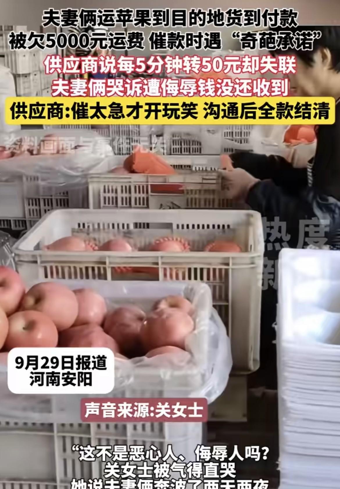据热度新闻,9月29日报道,一对夫妻将货物拉到送货地的时候,供应商迟迟不肯结运费,经夫妻俩的多次催促之后,供应商竟做出了令人“恶心”的行为。 事情的起因是老王(化名)是一名运货司机,每次出车的时候妻子也经常在车上帮忙。然而那天他看到了一个订单,需要将一车的苹果运送到凉山,刚开始的时候老王还觉得距离有些远,就不想接这个活了。但等他看到能赚到不少的时候,毫不犹豫的就接了。 紧接着他和妻子马不停蹄的赶紧将苹果搬运到了自己的车上,随后便开启了运货之路。夫妻二人整整忙活两天之后,终于将这批货运送到了供应商所提供的地址,到那儿卸完货之后,老王便向供应商要了运费。 这时候供应商却说运费要第二天再给,这时老王想着也不差这一天了,不料过了好几天之后,供应商一直没有说付运费的事情了,老王就主动问了起来。经过多次的催促之后,供应商就先支付了三千元。 不料这时候供应商还是没有给他转钱,而且等老王再去联系他的时候就已经联系不上了,无奈之下老王就找到了记者,希望记者能够帮忙协商这件事情,能够快点拿到尾款。 随后等记者联系到供应商之后,供应商的态度发生了很大的转变,说之所以给老王说一会儿给他转一点是在和老王开玩笑。此外,供应商还表明态度说最近货物,因为没有倒腾出去,资金有些紧张,过一段时间之后一定会一分不差的给老王转过去的。 当网友看到了这件事情之后,在下面评论说供应商老板做的也太不合理了,竟然拿着别人的血汗钱来开玩笑。 每个人赚钱都不容易,而且背后都有一家子需要养活所以,双双方之间一定要相互体谅,这样才能够长久的合作下去。 那么对于这件事情,你还有什么想说的吗?