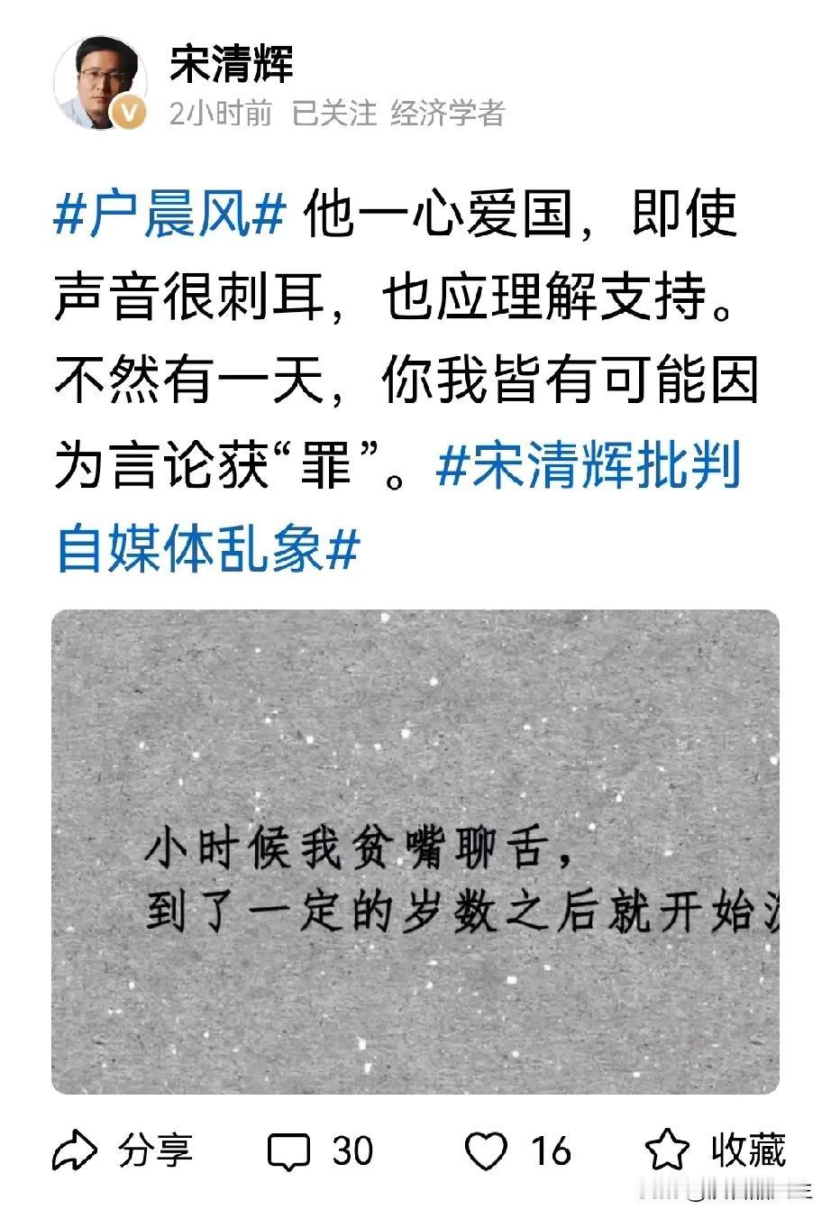 宋清辉如果一直这样大嘴讲下去,那下一个被封号的一准是他。 你喜欢他说的话吗?既是听着像好话,但从他嘴里说出来怎么听怎么让你别扭。到底谁的声音刺耳,他的有过之无不及。 经济学者从来不见研究经济,也没发表什么对经济的见解,反而对各种网红事件关注有加,不知道这样的经济学者是不是自封的,门槛是不是有点低了。