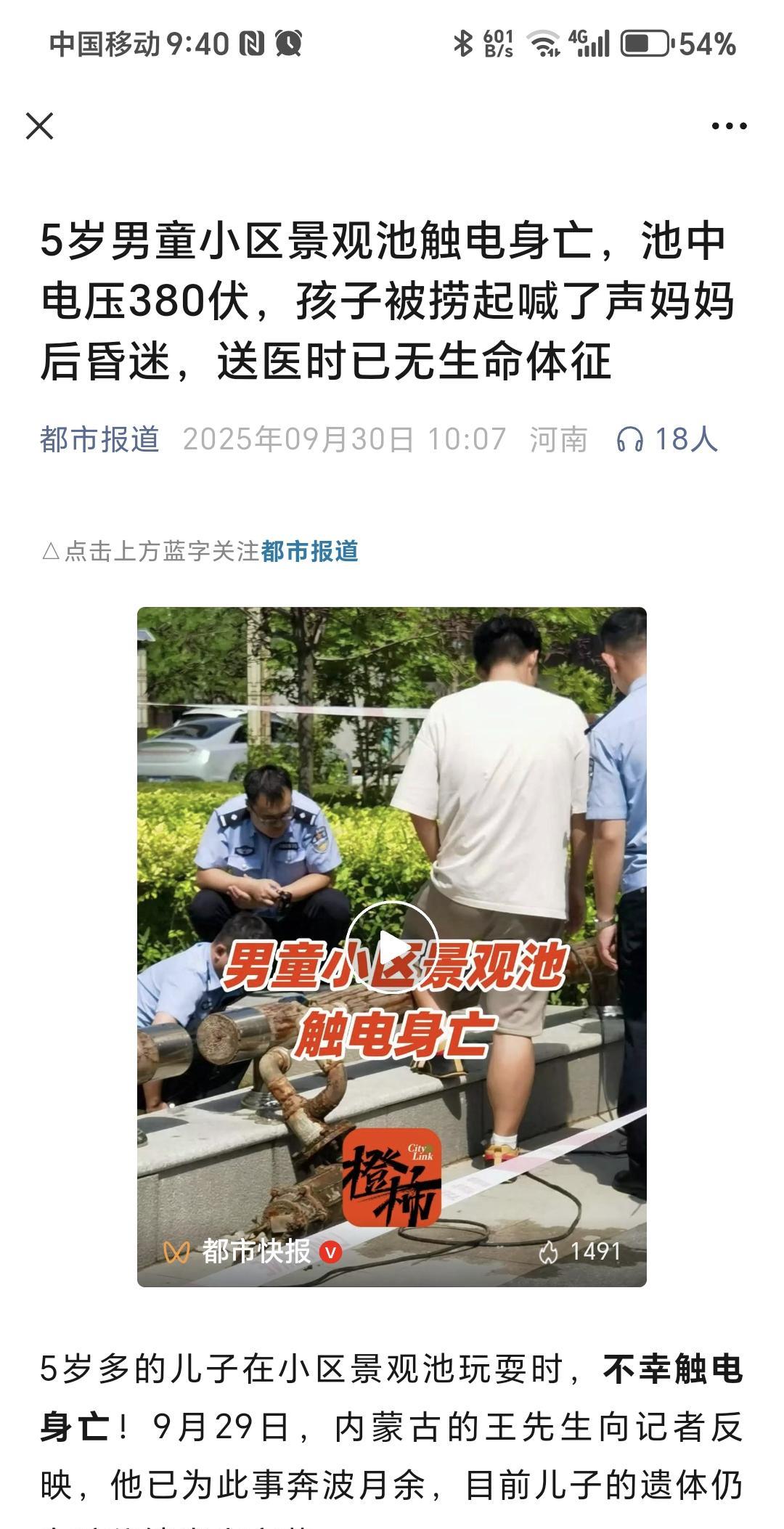 注意了,小区景观水池别让孩子进去玩水,尤其是有喷泉,有装饰灯的。 河南电视台都市