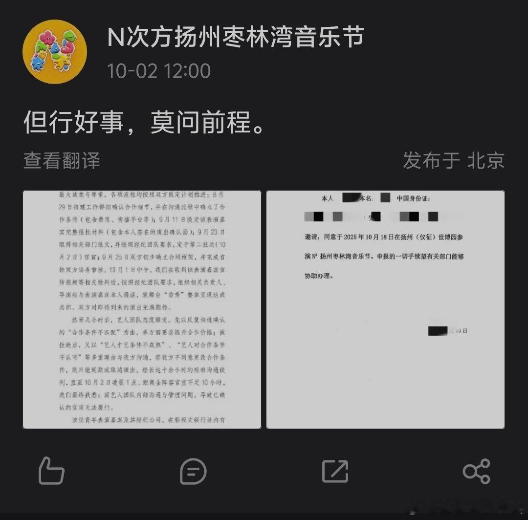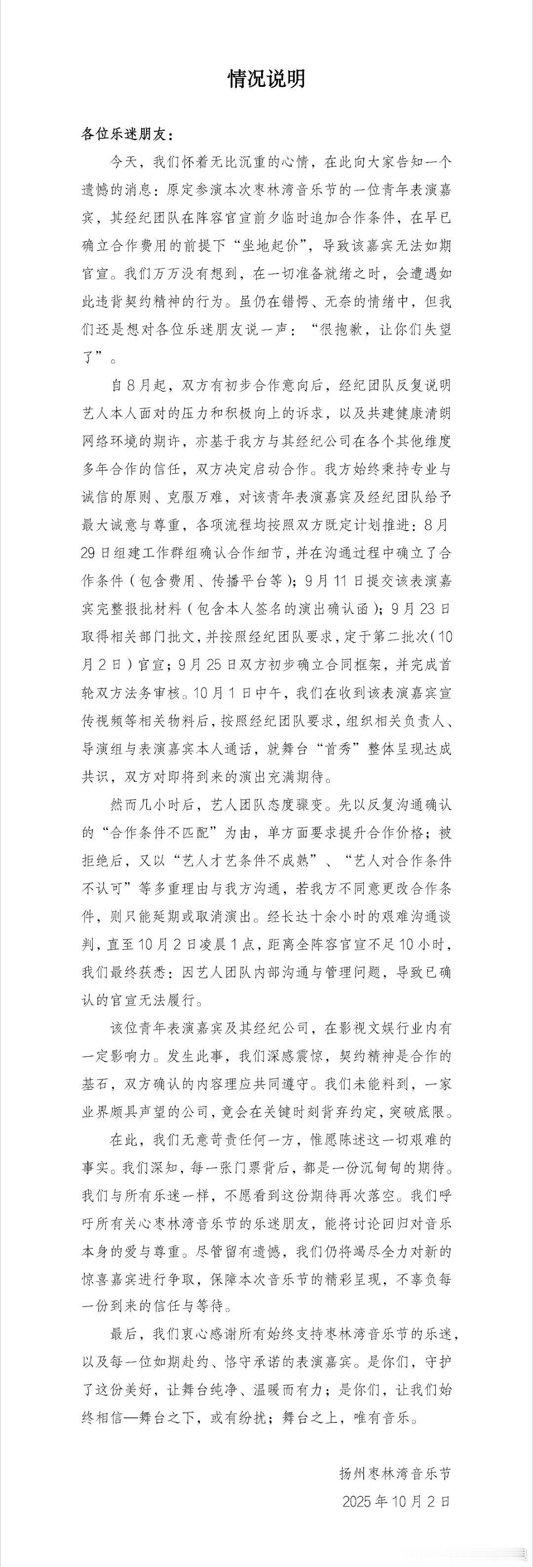 枣林湾音乐节发文:表示有艺人及其团队坐地起价,临时追加合作条件,导致该嘉宾无法如