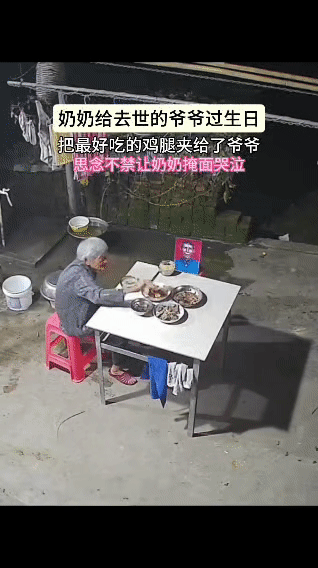 爷爷的生日到了,奶奶精心准备了几样菜,还特意做了爷爷爱吃的鸡腿。她把爷爷的照片放在桌前的椅子上,就像爷爷还在身边一样。吃饭时,奶奶夹起最好吃的鸡腿,往照片前的碗里放,嘴里念叨着:“老头子,吃鸡腿咯。”可看着照片里熟悉的面容,思念瞬间涌上心头,奶奶忍不住掩面哭泣。那无声的思念,仿佛能震耳欲聋,穿越生死,诉说着奶奶对爷爷深深的眷恋。老一辈的爱情 眷恋 岁月不饶人 回忆
