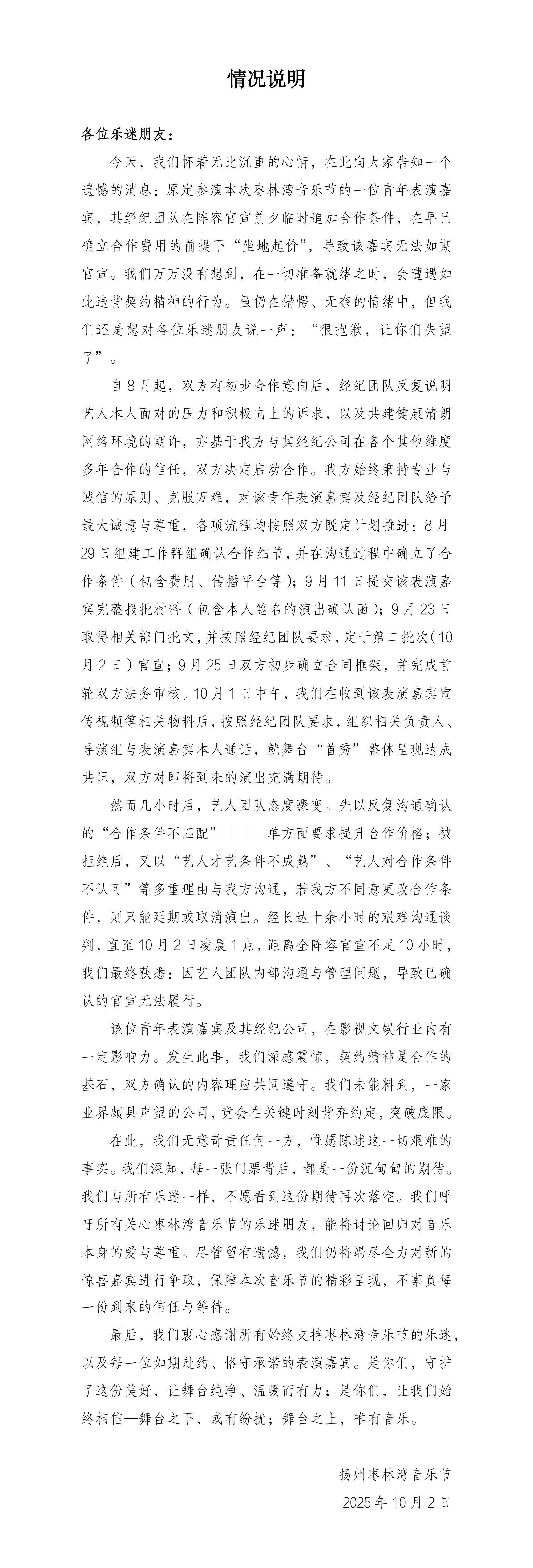 扬州枣林湾音乐节发文,有位青年本来一切准备好了,然后在原定合作费用上“坐地起价”,现在无法官宣了
