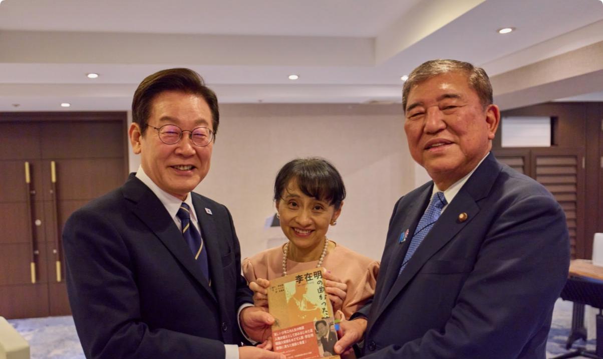 李在明近况照片:与日本首相石破茂夫妇见面谈话,共同举起李在明自传《我那弯曲的手臂》日语版合影留念。 时间是9月30日。 地点:釜山威斯汀朝昕酒店。
