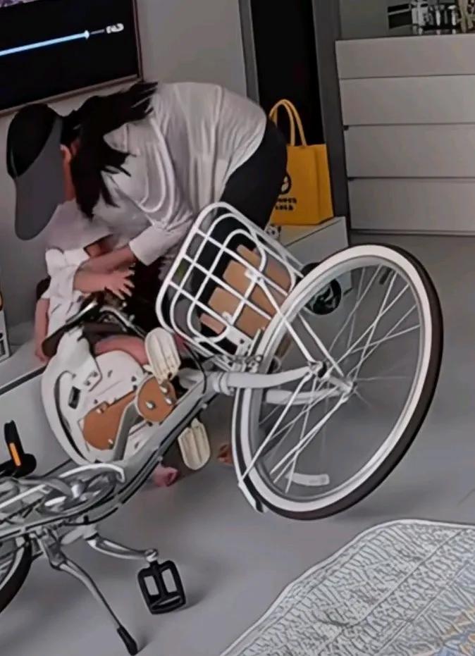 妈妈把宝宝放在自行车上,刚离开,可能是想拿点东西,结果自行车倒地,把宝宝摔得哇哇