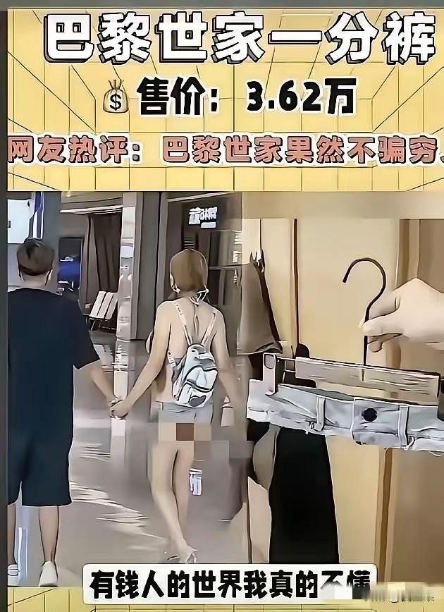 哎哟,妈呀,这都成时尚了。 我还以为女孩儿大姨妈来了,流了一裤子呢。 还想说,这是谁拍的,怎么不赶紧提醒下女孩儿? 再看看,原来还有男的穿这样的裤子, 男的总不至于来大姨妈吧。 最后才知道这竟然是国际时尚品牌巴黎世家专门设计的裤子。 这真的时尚,真的美吗? 听说售价还不低呢,1.3万美元,合人民币9万多了。 将近10万块钱买这样的裤子? 干脆哪个月来大姨妈的时候别用卫生巾,让它血染风采得了, 现在就看中品牌啥也不顾了是不? 还有那个裤子,也是巴黎世家出品的, 光有腰没裤腿啊,怎么能叫裤子呢? 这跟骗子有什么两样呢? 哦,不一样,这是明骗,打的就是名牌,阳谋。 唉,反正骗得不是我的钱。