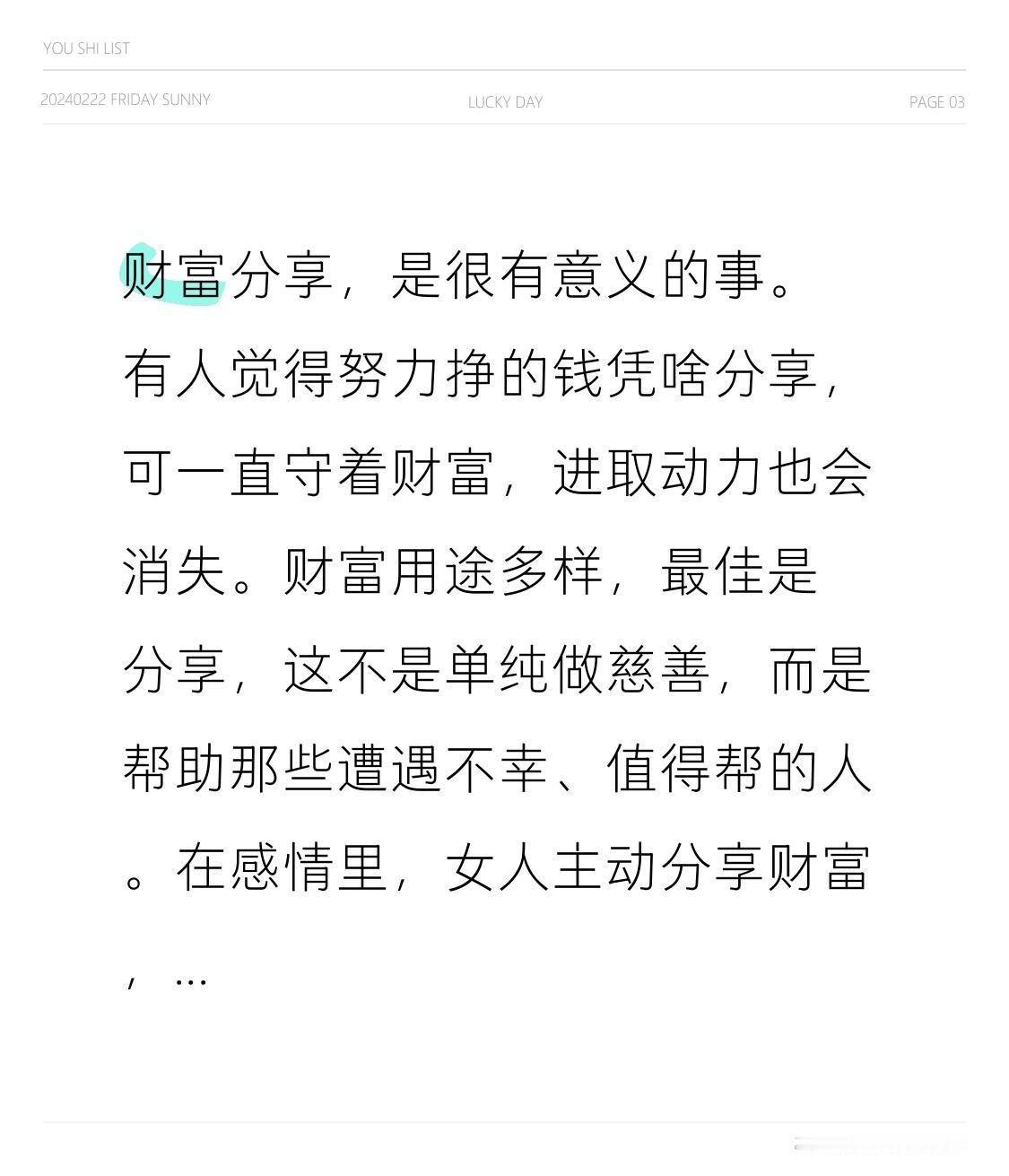 财富分享,是很有意义的事。有人觉得努力挣的钱凭啥分享,可一直守着财富,进取动力也会消失。财富用途多样,最佳是分享,这不是单纯做慈善,而是帮助那些遭遇不幸、值得帮的人。 在感情里,女人主动分享财富,意义非凡。这不是简单的金钱流转,而是情感的深度告白。她愿意让你走进她用辛勤构筑的世界,相信你能懂她每笔收支背后的故事。真正成功快乐的有钱人也爱分享,分享财富,说不定价值还会翻倍呢。 财富