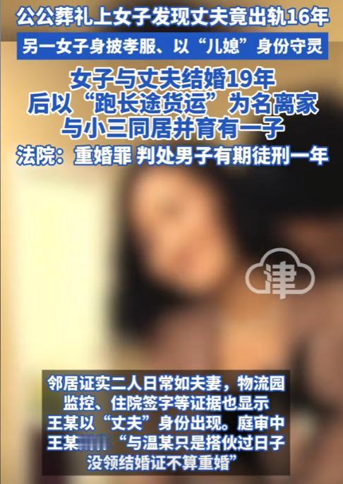 山东临沂,女子在公公的葬礼上看到一陌生女子披麻戴孝为公公守灵,然而当女子和一众亲友询问陌生女子是谁时,她却以儿媳妇自居,这让女子和一众亲友面面相觑。女子的丈夫十分慌张,立即解释这陌生女子只是过来帮忙的,还让大家别多想。(来源:山东省临沂市中级人民法院) 尚女士和丈夫王某结婚已有19年。王某是个大车司机,几乎常年在外,夫妻俩聚少离多,但在尚女士眼中,王某如此在外拼搏,都是为了这个家。 然而令尚女士没想到的是,这一切都是她自己想得太多了。在2022年6月,王某的父亲去世,尚女士作为儿媳妇自然是披麻戴孝,忙里忙外。 可在葬礼期间,她却看到了令其心碎的一幕。尚女士和一众亲友在公公的灵堂前,看到了女子温某正穿着孝服,跪在公公的遗像前烧纸。 尚女士等人左顾右盼,满脸的疑惑,大家都不认识温某。这时,一位亲戚走去询问温某是谁,谁知她竟十分坦然地回答:“我是王某的老婆。” 这下全场其他人都看向了尚女士,满脸的疑惑,而尚女士更是又气又懵。王某当时就在不远处,他听到了温某的话后,立即赶了过来说:“她就是来帮忙的,大家别多想。” 然而经过一番调查后,尚女士确认从2066年起,王某就以“跑长途”为由每月只回家两三天,而其他时间都和温某居住在邻县。 怒不可遏的尚女士直接报了警,指控王某犯了重婚罪,之后王某便被提起了公诉。 然而在庭审过程中,王某为自己辩解说:“我和温某就是搭伙过日子,也没有领证,这不算重婚。” 那从法律角度来讲,王某的行为是否构成重婚罪? 根据《刑法》第258条规定,有配偶而重婚的,或者明知他人有配偶而与之结婚的,处2年以下有期徒刑或者拘役。 从上述规定以及法律实践来看,目前认定重婚罪的情形有两种,一种是法律重婚,即在已经登记结婚的情况下,又与他人登记结婚的。另一种是事实重婚,即有配偶者与他人以夫妻名义长期同居生活的。 一般来说,以夫妻名义长期同居生活需要达到邻居或者家人都认为是夫妻的程度。 警方在接到尚女士报警后,前往邻县进行了调查,从邻居口中得知王某和温某在2016年开始,就已经公开以夫妻名义共同生活,且育有一子。邻居、同事、医院都能证实他们就是“夫妻”。 其中一位邻居表示:“我就看他们天天一起出门买菜,接送孩子,这不是明显的夫妻嘛!” 此外,在医院出具的一系列报告中,温某住院期间王某是以丈夫的身份签字的,二人的孩子的出生证明中的父亲一栏也是王某的名字。 同时,公司同事也表示:“一直以为王哥的老婆是温某。” 从这些证据来看,足以证明王某和温某是以夫妻名义长期同居生活的,而且是在王某和尚女士的婚姻关系存续期间。 因此,法院认为王某的情况已经构成重婚罪,故判决王某有期徒刑1年。 王某不服一审判决,提起了上诉,但二审法院维持了原判。 有不少人不理解,重婚罪是可以处罚男女双方的,为何温某没有获刑? 从法律规定来看,明知对方有配偶,仍与之登记结婚,或者以夫妻名义长期同居生活的,按照重婚罪处理。 也就是说,如果温某并不知道王某和尚女士已经结婚,她一直被蒙在鼓里,那温某就不构成重婚罪。 这里温女士没有被判刑,很有可能就是她也被王某给骗了。 最后,很多人依旧意难平,认为王某在16年期间,骗了两个女人,可法院只判1年有期徒刑,实在是太轻了。 对此,您怎么看?欢迎留言交流。