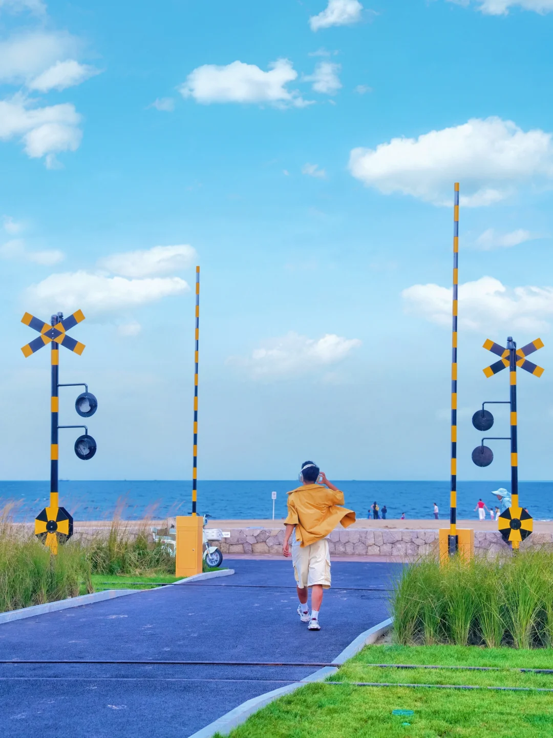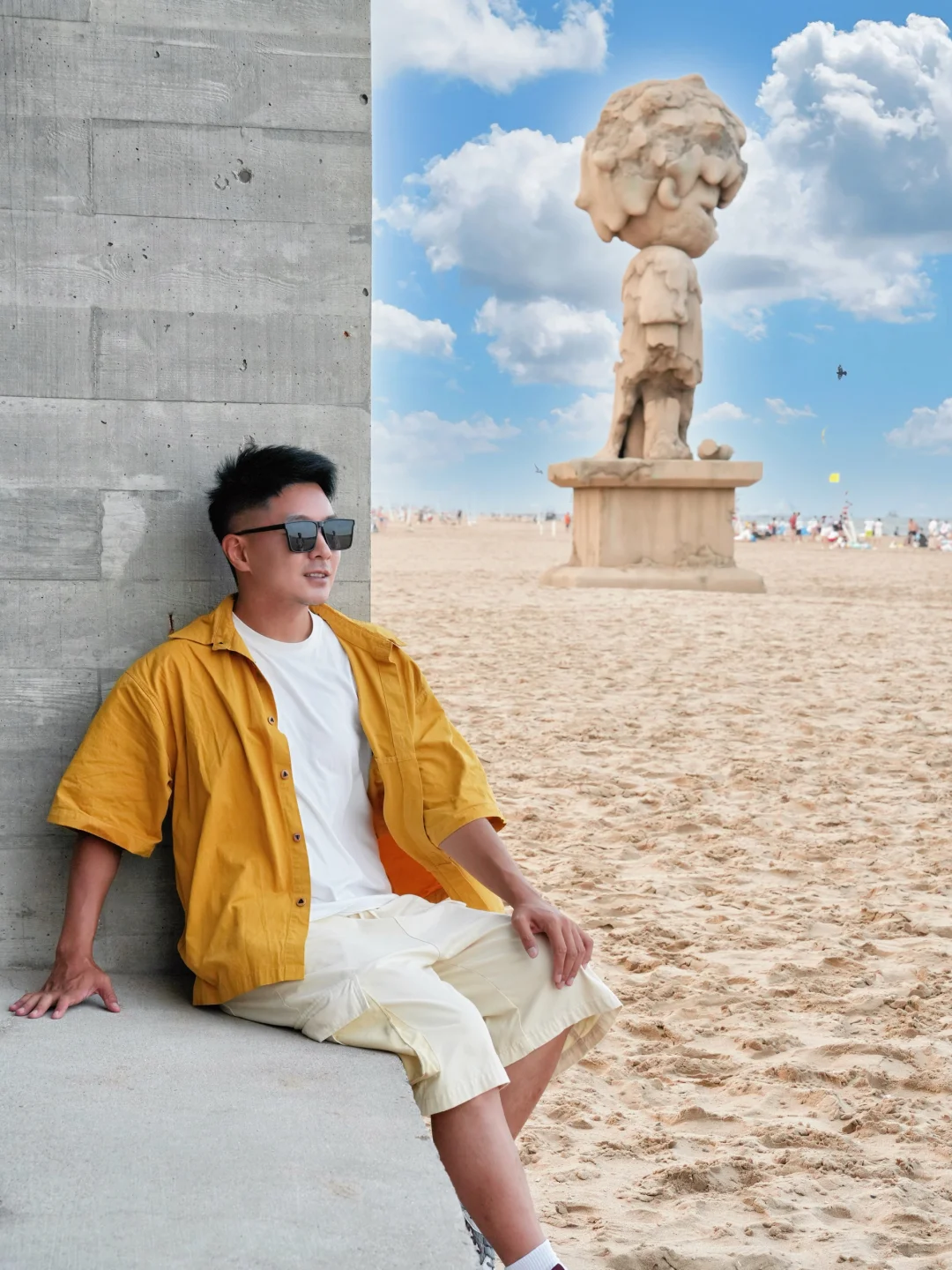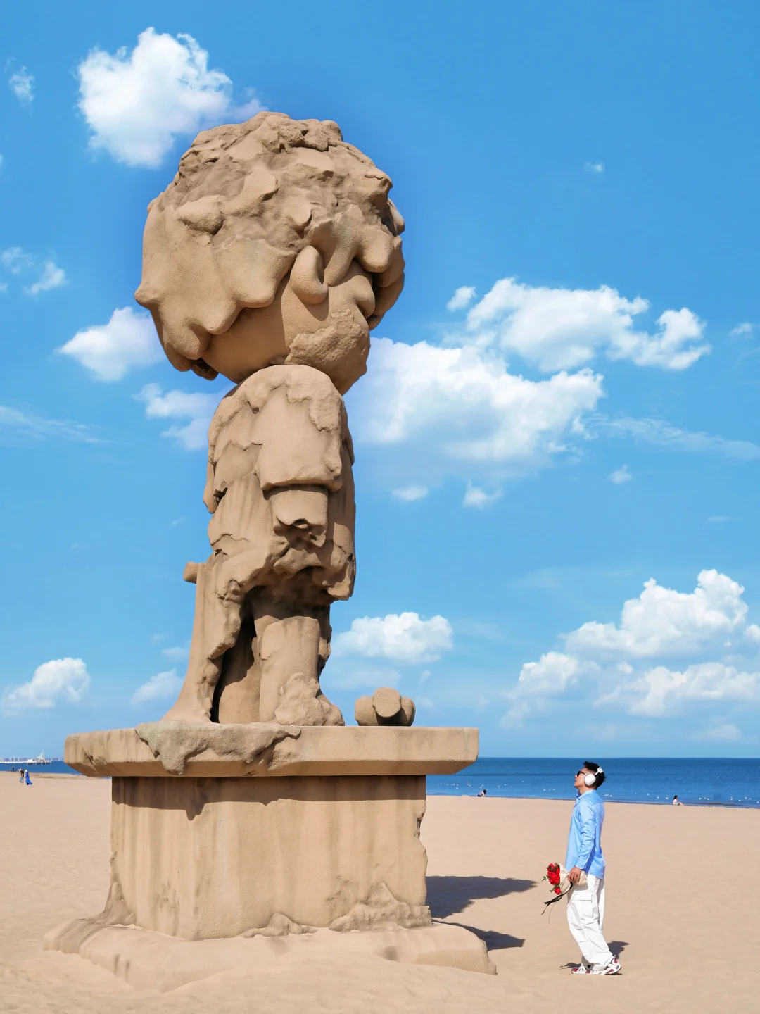 框架式构图拍与大海同框,侧面拍与小野雕塑同框