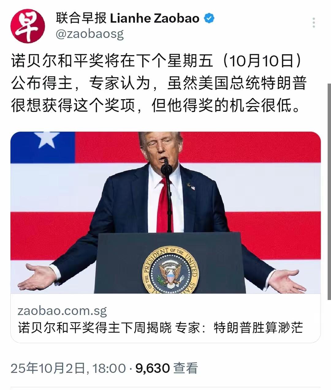 外媒:诺贝尔和平奖即将公布,特朗普得奖机会很低 新加坡联合早报10月2日报道称,诺贝尔和平奖将在下个星期五(10月10日)公布得主,专家认为,虽然美国总统特朗普很想获得这个奖项,但他得奖的机会很低。 有网友直言,得到了他心愿已了,会原形毕露,毫无顾忌;得不到他会自暴自弃,不再伪装。 特朗普心心念念的这个和平奖能否拿到?要看美国对世界的操控能力。其实,除了自然科学,其他评的不必在意,因主观形态浓厚。 大家对此怎么看?欢迎在评论区留言,共同交流探讨!