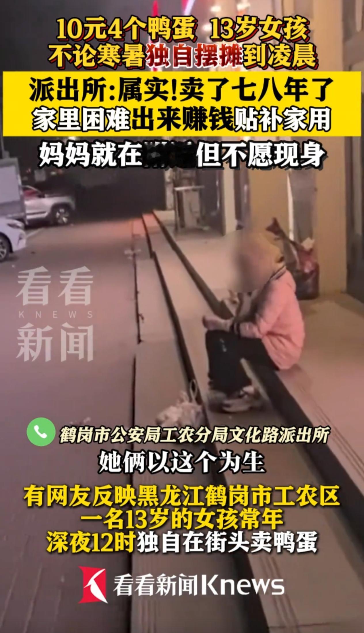 13岁女孩靠卖鸭蛋为生,太可怜了! 在鹤岗,一个年仅13岁的女孩,因父母离异,因家庭困难。大半夜12点还缩在商铺台阶上,身前纸盒里摆着塑料袋装的鸭蛋。女孩还会卖一些鲜花小乌龟 以此补贴家用。爸妈早就分开了,妈妈没正式工作,母女俩相依为命。白天上课,晚上放学就出摊,寒暑都没断过。警方也证实了情况,说她妈妈偶尔会陪着,但大多时候是孩子自己守着摊位。生活给了她太多难,但这孩子不抱怨不退缩,一门心思帮妈妈分担。这份懂事和韧劲太难得,难怪大家都夸她内心强大。 鹤岗菜市场鲜鸭蛋市价约1.5元一个,普通鲜花一束5元,小乌龟一只10元,她每晚守到深夜,最多也就卖10个鸭蛋、3束花、2只龟,算下来才50多块,刚够母女俩两天的菜钱和水电费。 鹤岗2023年民政数据显示,当地有120多名困境儿童获临时救助,现在她所在社区已帮着申请低保,每月能多600元,妈妈也在社区介绍下找了保洁零活,能多陪她出摊了。 她学校的课后托管服务到18点,不用下课就往摊位赶,学校还帮她申请了义务教育助学金,杂费全免,班主任偶尔会给她带文具和牛奶。 这孩子的韧劲藏着太多委屈,光夸“内心强大”不够。还好有社区、学校的实在帮扶,能帮她少熬点夜、多补点课。希望这样的帮助能一直跟着她,别让生活的苦,吞了她本该有的少年时光。