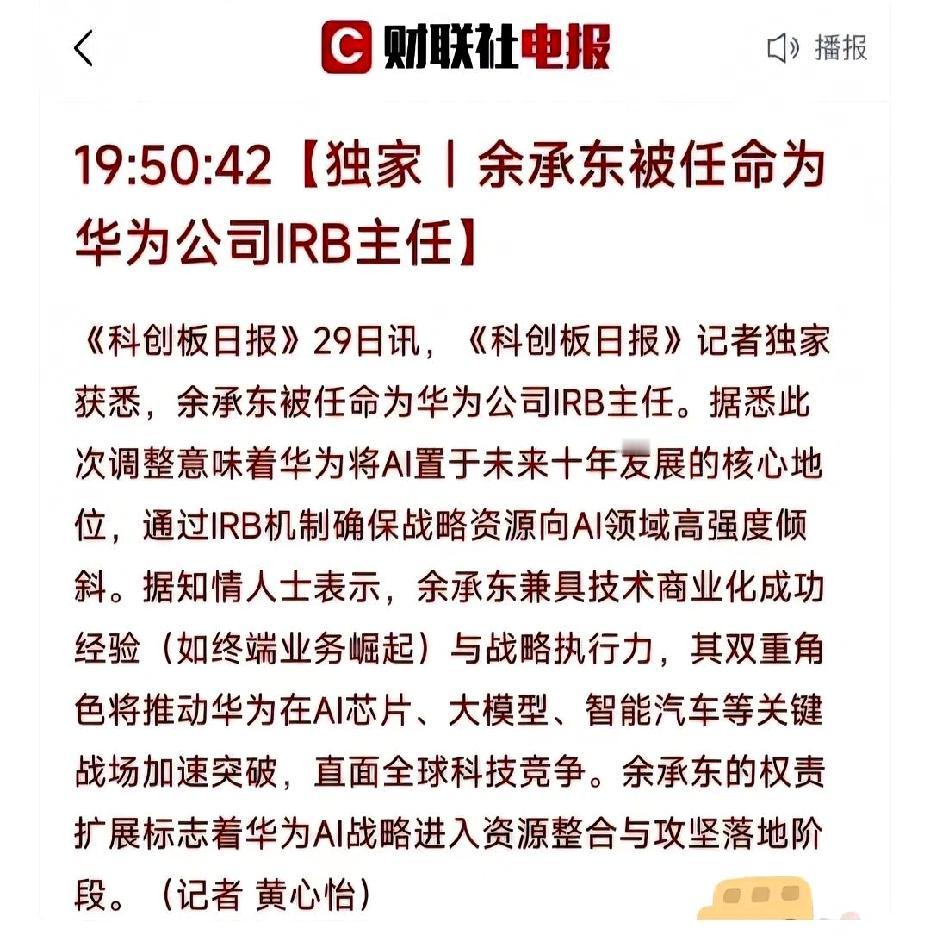 华为今天这步棋,看得我后背发凉。 把余承东放到了IRB主任的位置上。 外行看热闹,觉得就是个升职。但稍微懂点的都知道,这哪是升职啊,这是把整个华为的‘军火库’钥匙,直接塞他手里了。 华为今天任命余承东为产品投资评审委员会(IRB)主任,任正非亲自签发了相关文件,任命余承东担任IRB主任,这是华为未来十年最重要的决策。 IRB被称为“最高决策机构”,掌握战略资源的分配和项目的立项。 余承东的任命意味着他将主导华为的AI战略,并确保资源向AI领域倾斜,同时他也将继续担任华为常务董事、终端BG董事长,掌握资源和决策权。 余承东在华为30年的职业生涯中,多次证明了将技术转化为商业成功的能力,近期,华为鸿蒙5终端设备数量突破2000万台,这显示出余承东在市场开拓上的强劲增长。 华为在AI芯片、大模型和智能汽车领域面临挑战,余承东的决策将直接影响华在未来十年的科技竞争地位。 麻烦看官老爷们右上角点击一下“关注”,既方便您进行讨论和分享,又能给您带来不一样的参与感,感谢您的支持!