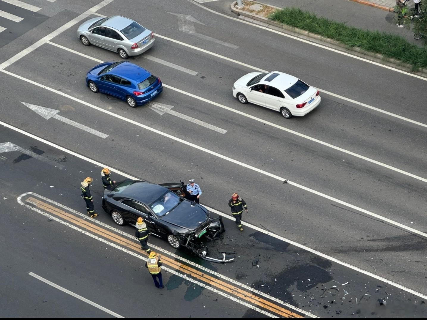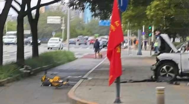 我才意识到陈震这下是撞得有多狠,把比亚迪直接撞出了5条车道+绿化隔离带+非机动车道+人行道,然后整个嵌进绿化,中间还拐了辆电瓶车,我都不敢想这个速度有多快。。。(希望比亚迪车上的人和骑电瓶车的人没事)