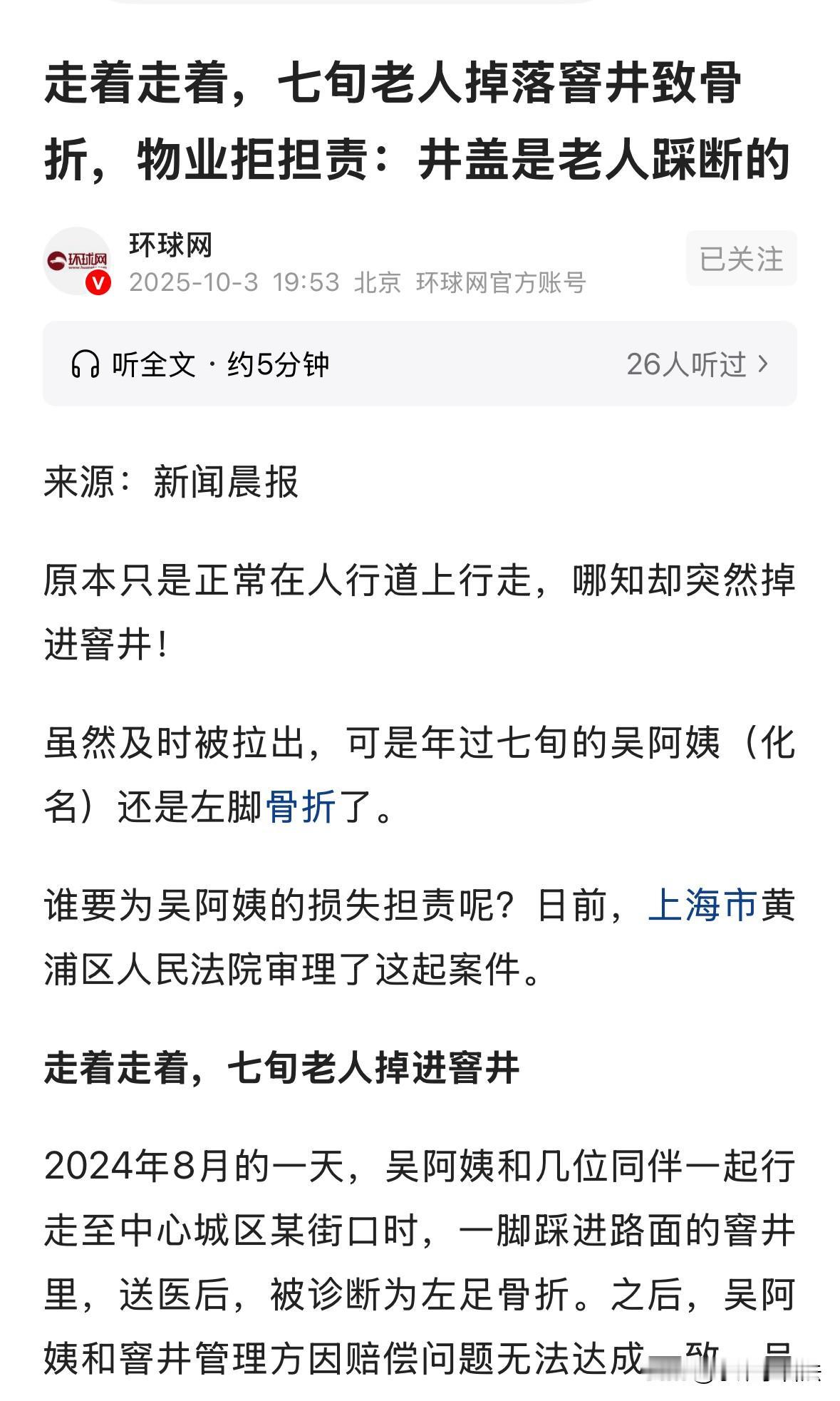 上海,70岁大妈在走路时,一只脚踩进没有井盖的窨井里,导致左脚骨折,跟窨井的管理