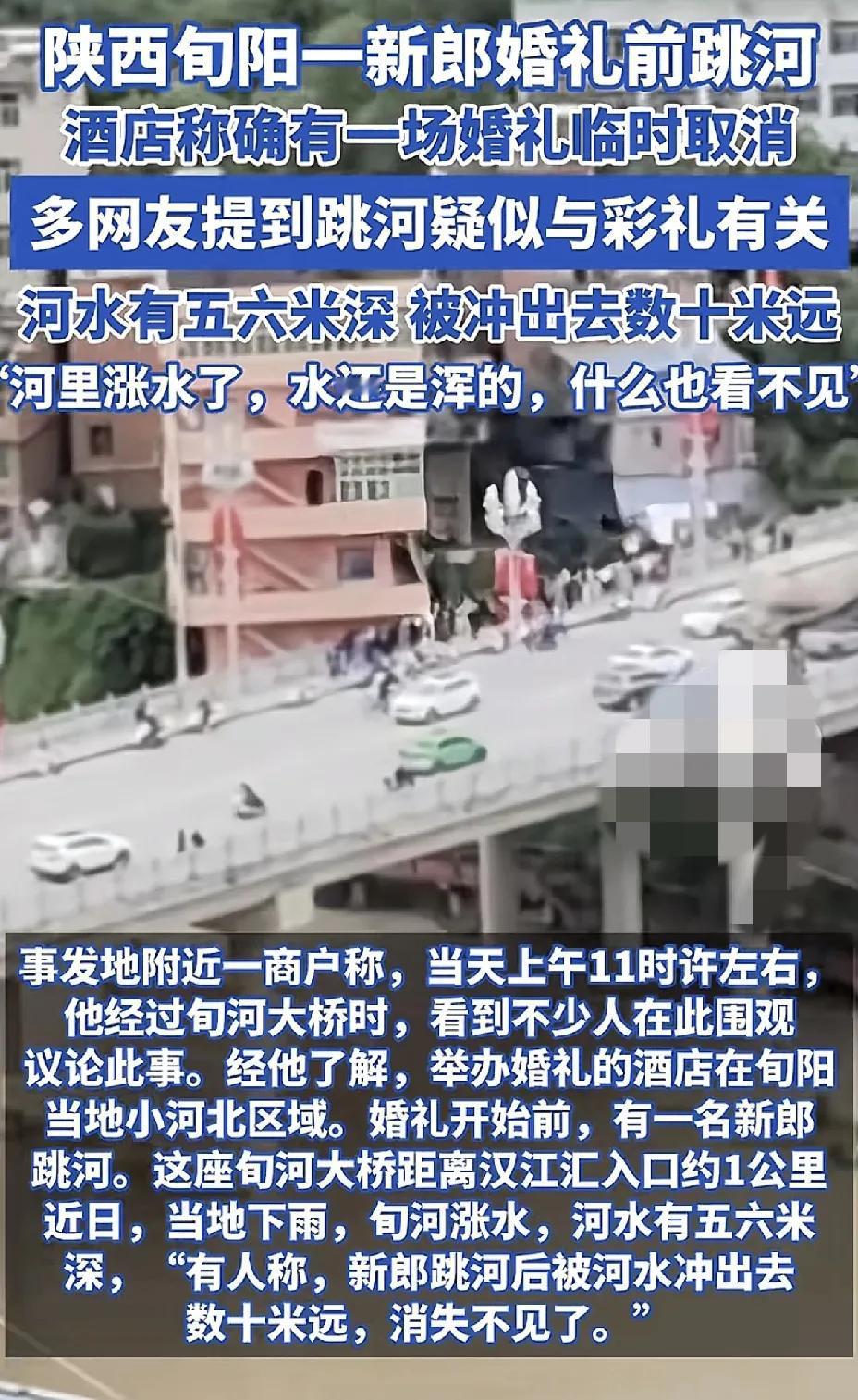 看到一篇新闻,挺让人无奈的。10月3日这天,原计划于当日中午举办婚礼的新郎,在上午11时左右,从旬河大桥上一跃而下,跳入水深流急的河中。在被冲出数十米后,新郎消失在水面。网传是因为女方临时突然要求加2到10万的彩礼,男方无力承担,觉得受到了侮辱,进而采取了极端的行为。 其实没有什么比生命还重要了,婚可以不结,但一定要快乐的活着。这一跳,父母该怎么办啊。彩礼 婚姻