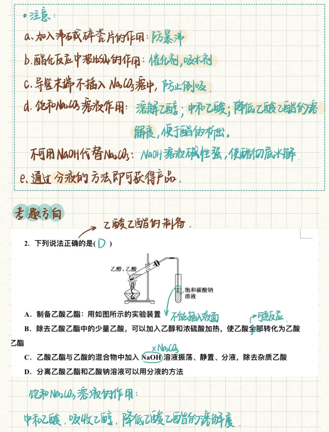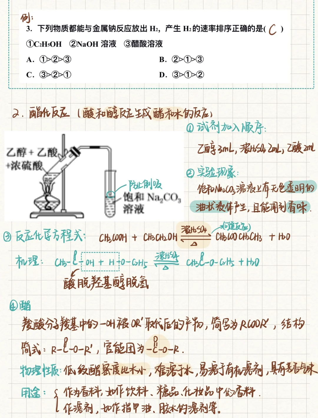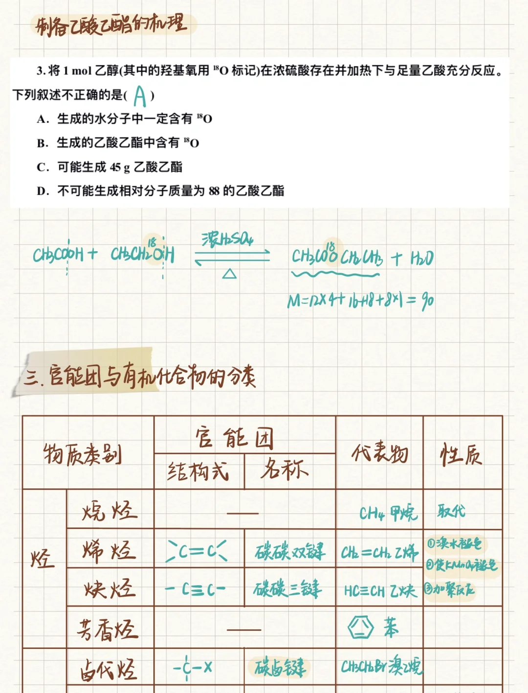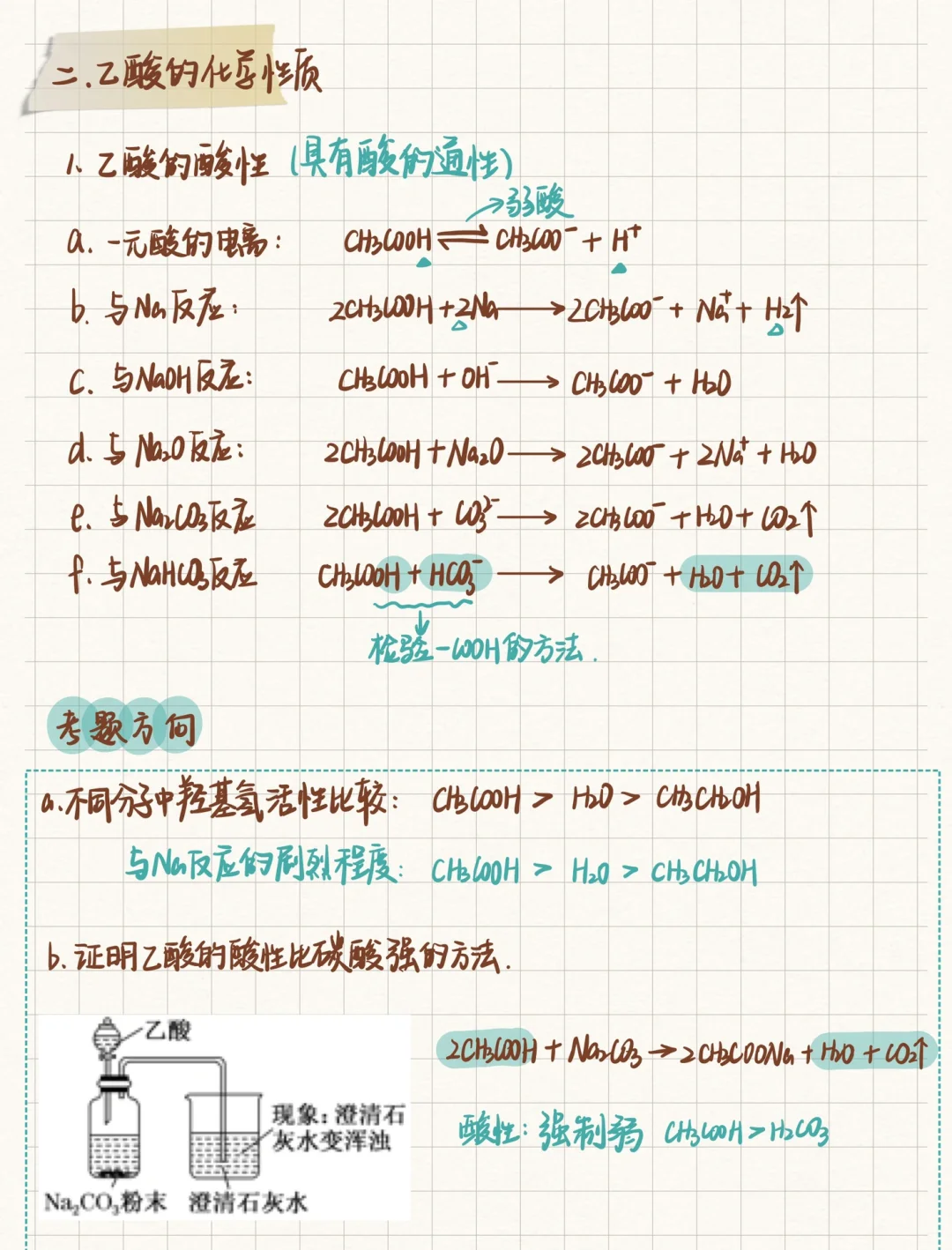 🍀乙酸的总结笔记来啦!关于乙酸要掌握羧基的检验方法;酯化反应(重点)的操作步骤、反应原理、实验中各个试剂的作用、反应条件 🍀官能团也是我们理解有机反应的重中之重,不同的官能团能有着不同的化学性质、所以我们虽然学的是代表物,但其实在学带某种官能物质的总体性质