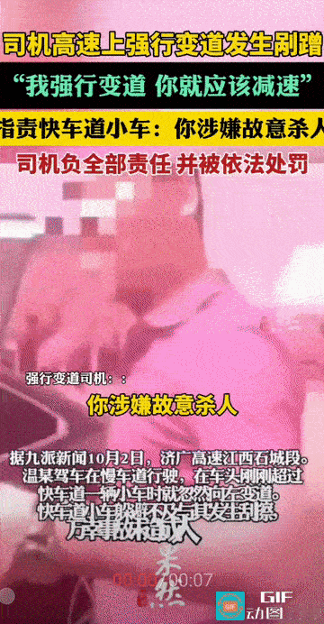 “我强行变道,他就应该减速!”高速公路上,一辆在慢车道行驶的汽车突然加速超越快车道车辆,车头刚超过就猛地向左变道,刺耳的刹车声后是金属刮擦的刺耳声音。两名车主立即靠边停下,谁知那强行变道的司机竟还强词夺理,指责快车道小车:“你涉嫌故意杀人!” 来源:【齐鲁壹点】 这起事件发生于2025年10月2日,国庆长假的第二天,济广高速江西石城段车流如织! 慢车道上,男子温某驾驶的车辆加速追赶着快车道的一辆小车! 就在车头刚刚超过快车道小车的瞬间,温某突然向左猛打方向盘,试图强行变道! 快车道上的小车措手不及,尽管司机尽力躲避,两车还是发生了刮擦! 幸运的是,这次事故没有造成人员伤亡。面对赶到现场处理的交警,温某丝毫不觉得自己有过错! 他语出惊人,指着快车道小车司机对交警说:“你涉嫌故意杀人!” 当交警明确指出的其行为属于“强行变道”的严重违法行为时,温某继续辩解! “我强行变道,他就应该减速啊!”温某振振有词地把事故责任推向对方! 他甚至对交警抱怨道:“他的速度,按正常逻辑应该是减速,他是加速!” “我变道他不给我变!”温某的这番话,暴露了其根深蒂固的错误驾驶观念——仿佛他一旦打了变道主意,其他车辆就必须让行! 面对温某的强词夺理,现场交警进行了长达一小时的严肃教育和批评! 温某最终认识到了自己的错误,接受了因变更车道影响其他车辆正常行驶导致事故的全部责任,并被依法处罚! 假期期间车流量大,驾驶员应提前规划路线,不要随意变道,如果要下高速,至少提前一公里变道至右侧车道! 一旦错过出口,唯一正确的选择就是继续前行——下一个出口可以掉头,但生命没有重来一次的机会! 每一起强行变道事故的背后,都藏着司机“就差这一秒”的侥幸心理,最后的结果就是不幸!