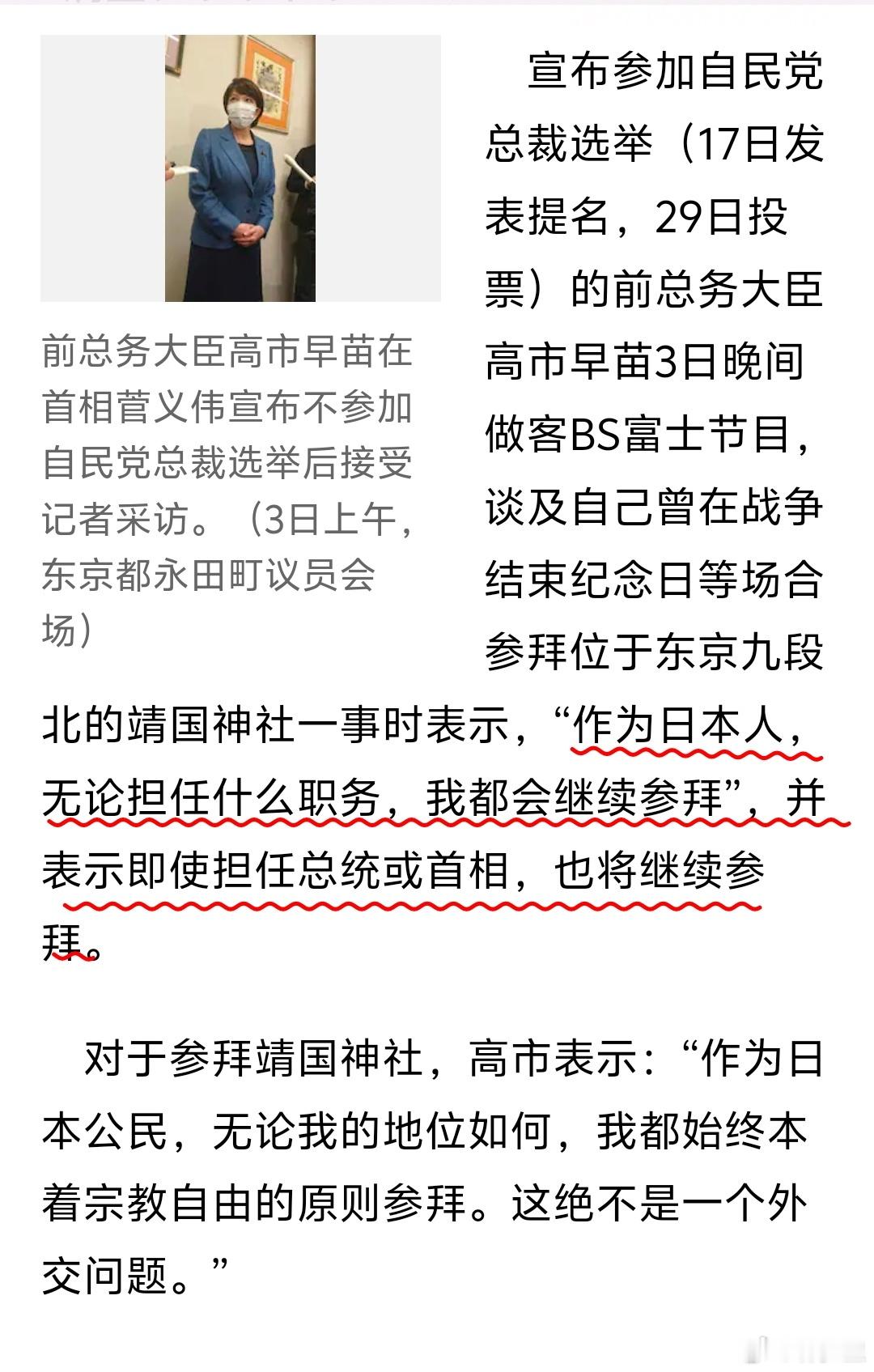 她主张参拜靖国神社,她很早就说了成为首相后也会继续参拜。