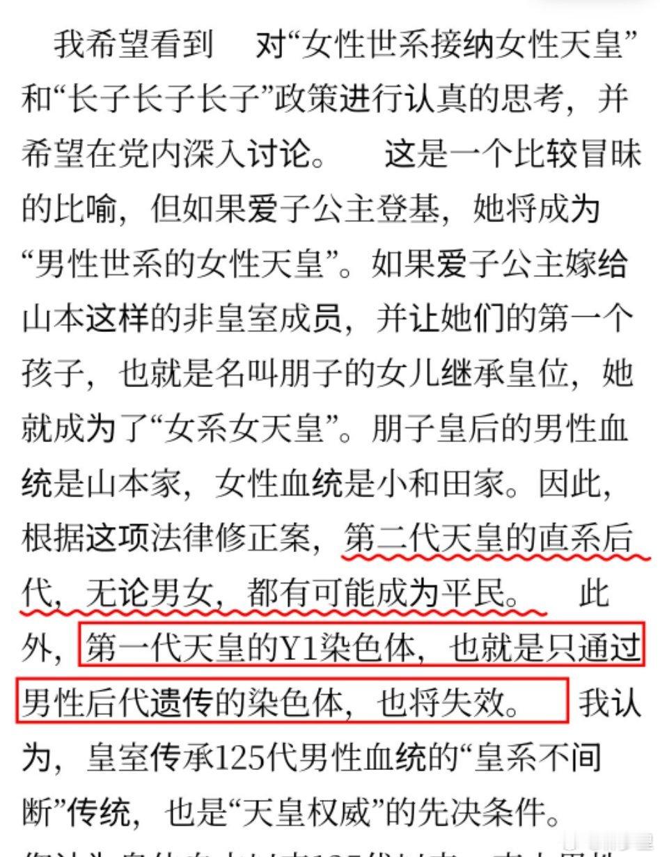 她觉得,如果女性天皇继承,日本从第一代传承下来的男天皇染色体就会消失[费解]。