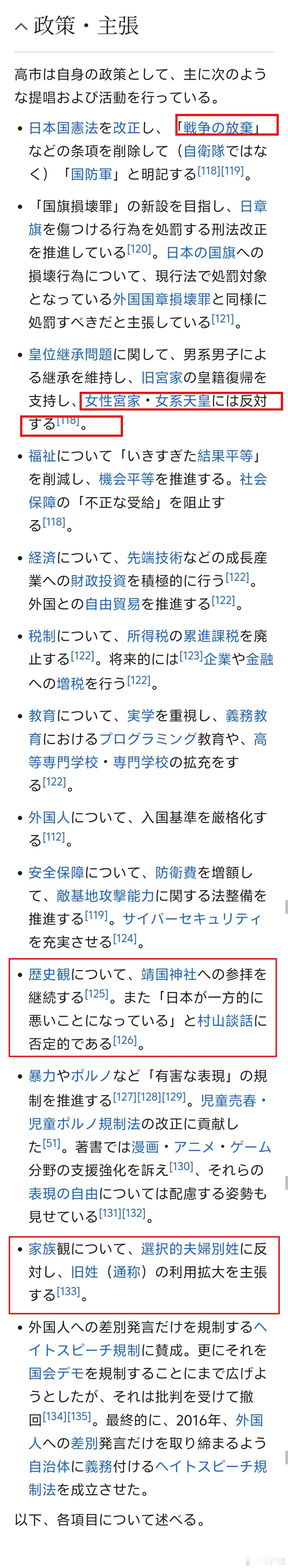 她主张删除日本宪法中“放弃战争”的条款,也就是说她有着军国主义思想。