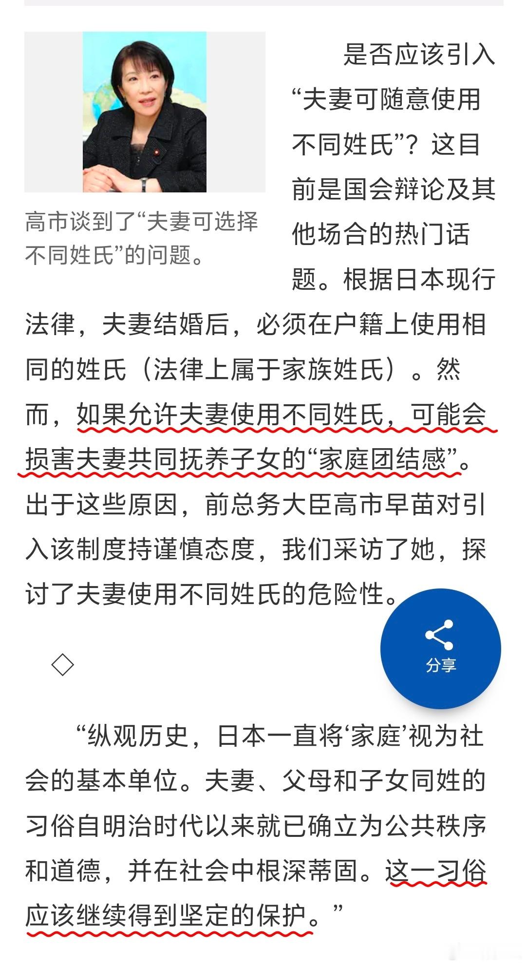 然后,她反对日本婚后可以自由选择不同的姓氏,她支持日本夫妻婚后冠夫姓的传统,她说这一习俗要坚定的保护。