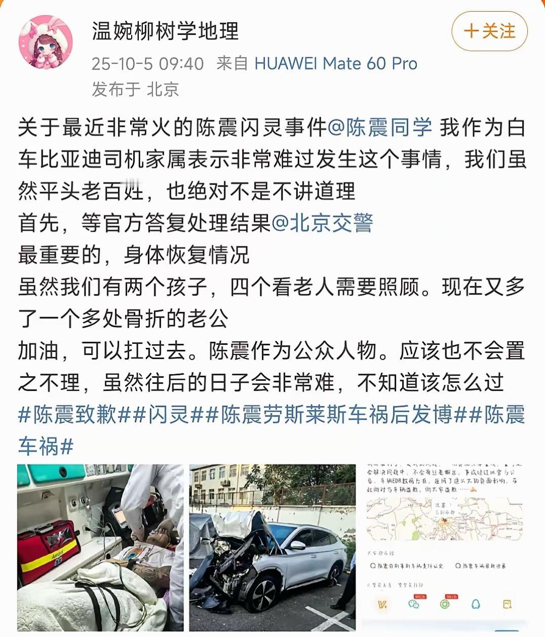 陈震交通事故比亚迪车主家属终于发声了,家里上有老下有小,表示生活压力山大,并且并