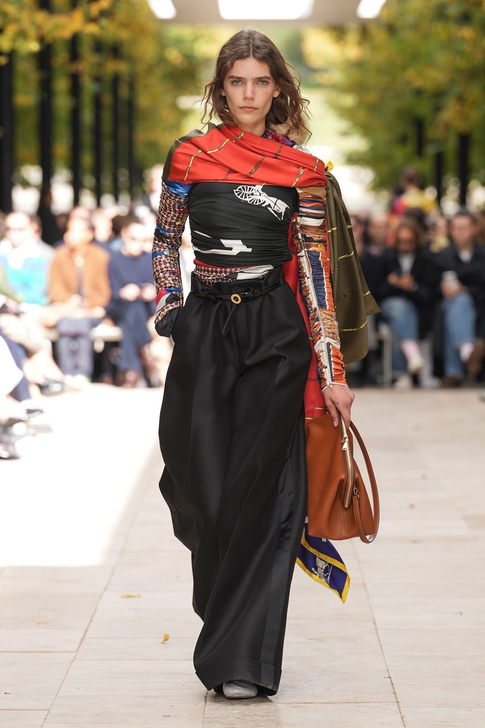 模特们的 Look 同样以黑、白、驼为基础,再以红、黄、蓝、紫等鲜艳饱和色的披肩、印花裙、针织衫、手袋、鞋履来“提亮”造型,增加层次感。