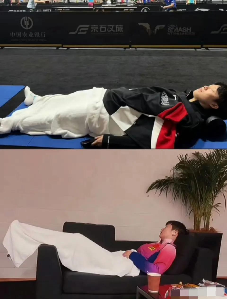 这一仗真的太不容易了, 王楚钦身兼三项, 都拿到了冠军, 累得睡在了球馆里, 在嘈杂的训练馆都能睡着, 可想而知有多累, 想起20岁不到的孙颖莎, 同样累到瘫睡在沙发上, 运动员不容易, 只希望他们健康涨球, 用更好的状态迎接下一场比赛。