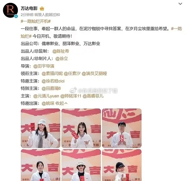 全女悬疑剧一路灿烂开机。田嘉瑞粉丝在维⭕保证唯一男主戏份,不要给男配加戏