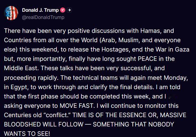 🚨🇺🇸🇵🇸特朗普:快,哈马斯,否则将发 生大规模流血事件! “本周末,我们与哈马斯以及世界各国(阿拉伯、穆斯林和其他国家)进行了非常积极的讨论,旨在释放人质、结束加沙战争,但更重要的是,最终实现我们长期以来寻求的中东和平。 这些会谈非常成功,而且进展迅速。 技术团队将于周一在埃及再次开会,讨论并澄清最终细节。 我被告知第一阶段应该在本周完成,我要求每个人都快速行动。 我将继续关注这场长达数百年的“冲突”。 时间至关重要,否则将会发生大规模的流血事件--这是任何人都不想看到的!” 来源:Truth Social 🚨🇺🇸🇵🇸 TRUMP: FAST, HAMAS, OR MASSIVE BLOODSHED WILL FOLLOW! "There have been very positive discussions with Hamas, and Countries from all over the World (Arab, Muslim, and everyone else) this weekend, to release the Hostages, end the War in Gaza but, more importantly, finally have long sought PEACE in the Middle East. These talks have been very successful, and proceeding rapidly. The technical teams will again meet Monday, in Egypt, to work through and clarify the final details. I am told that the first phase should be completed this week, and I am asking everyone to MOVE FAST. I will continue to monitor this Centuries old “conflict.” TIME IS OF THE ESSENCE OR, MASSIVE BLOODSHED WILL FOLLOW — SOMETHING THAT NOBODY WANTS TO SEE!" Source: Truth Social