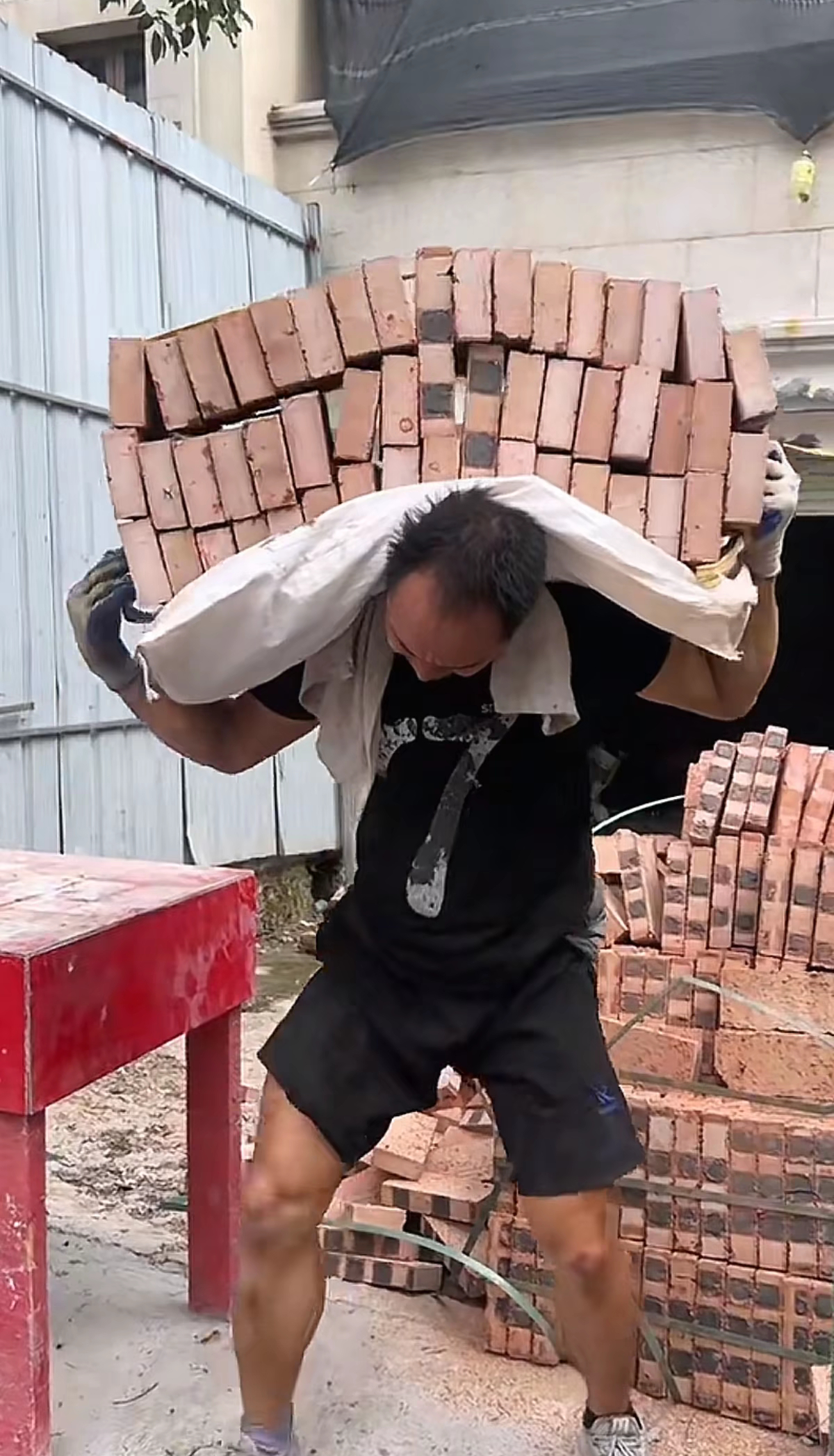 刚看到这个,真正的搬砖,他说一天能挣1000多,但靠的不只是体力,更是意志力。挣钱不易啊,你猜一下他肩上的砖有多重?[允悲]