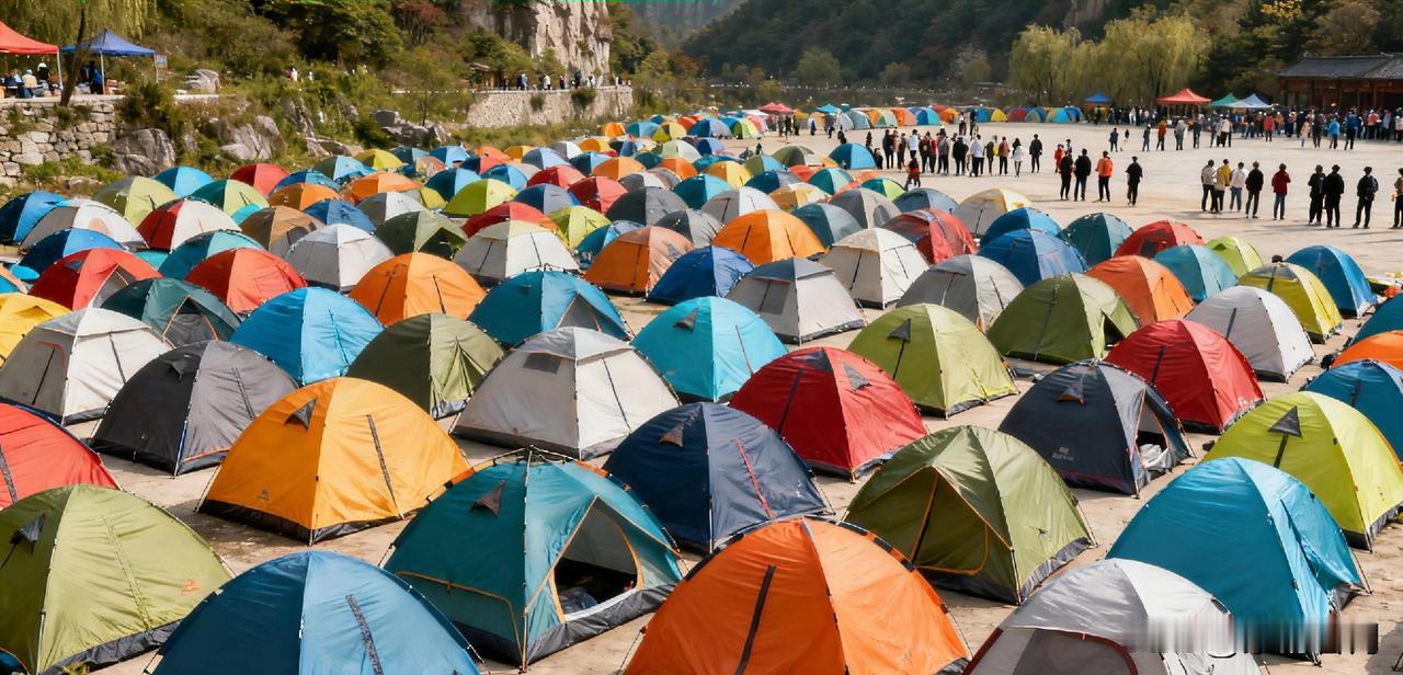 国庆景区全是帐篷!这波“野宿”你敢试吗? “天当被、地当床,帐篷当蚊帐”,说真的,今年国庆去景区,我直接看愣了——哪是旅游啊,街边、景区空地上全是帐篷,密密麻麻一片,五颜六色的,路过的人都忍不住回头瞅,还以为出啥事儿了,差点以为是集体“躲灾”呢! 其实根本不是啥怪事儿,就是游客自己搭的“移动小家”!你瞅那些帐篷,大的小的、红的蓝的,凑一块儿还挺有feel。现在年轻人特爱这么玩,小情侣、带娃的年轻爸妈都有,说白了,一是图新鲜,二是真省钱——谁愿意旺季花大几百上千住酒店啊! 说起这事儿,早有苗头了。之前一到旅游旺季,景区酒店、民宿跟坐火箭似的涨价,普通酒店一晚千把块,民宿也翻倍,有时候有钱还订不上。但现在大家想法变了:不就是睡一晚吗?舒服、能歇脚就行,犯不着为了“有面儿”硬扛高价酒店。车里能对付,帐篷里还能看星星,多值啊! 再说了,现在日子也不轻松。一个月工资到手,扣完房租、水电,还房贷的再扒一层,根本剩不下多少。既然都是住,为啥把钱扔在贵得离谱的住宿上?平时刷短视频,看别人徒步西藏、自驾,住帐篷也挺潇洒,心里早痒痒了——国庆不冷不热的,住帐篷还能跟星空、草地贴贴,多爽! 商家也贼会抓机会,现在帐篷做得特轻巧,叠起来能塞高铁行李架,带著走超方便。有的酒店更机灵,直接在草坪上搭帐篷,还给配热水澡,价格就酒店的三分之一,主打一个实在;连景区都松口了,专门划地儿让搭帐篷,安全又省心。 说真的,出门旅游的都懂,景区里的酒店死贵,便宜点的又离得老远。带个帐篷多方便,晚上在景区边上一搭,早上收了就能直接玩,不用慌慌张张赶行程,还能省不少钱。国庆