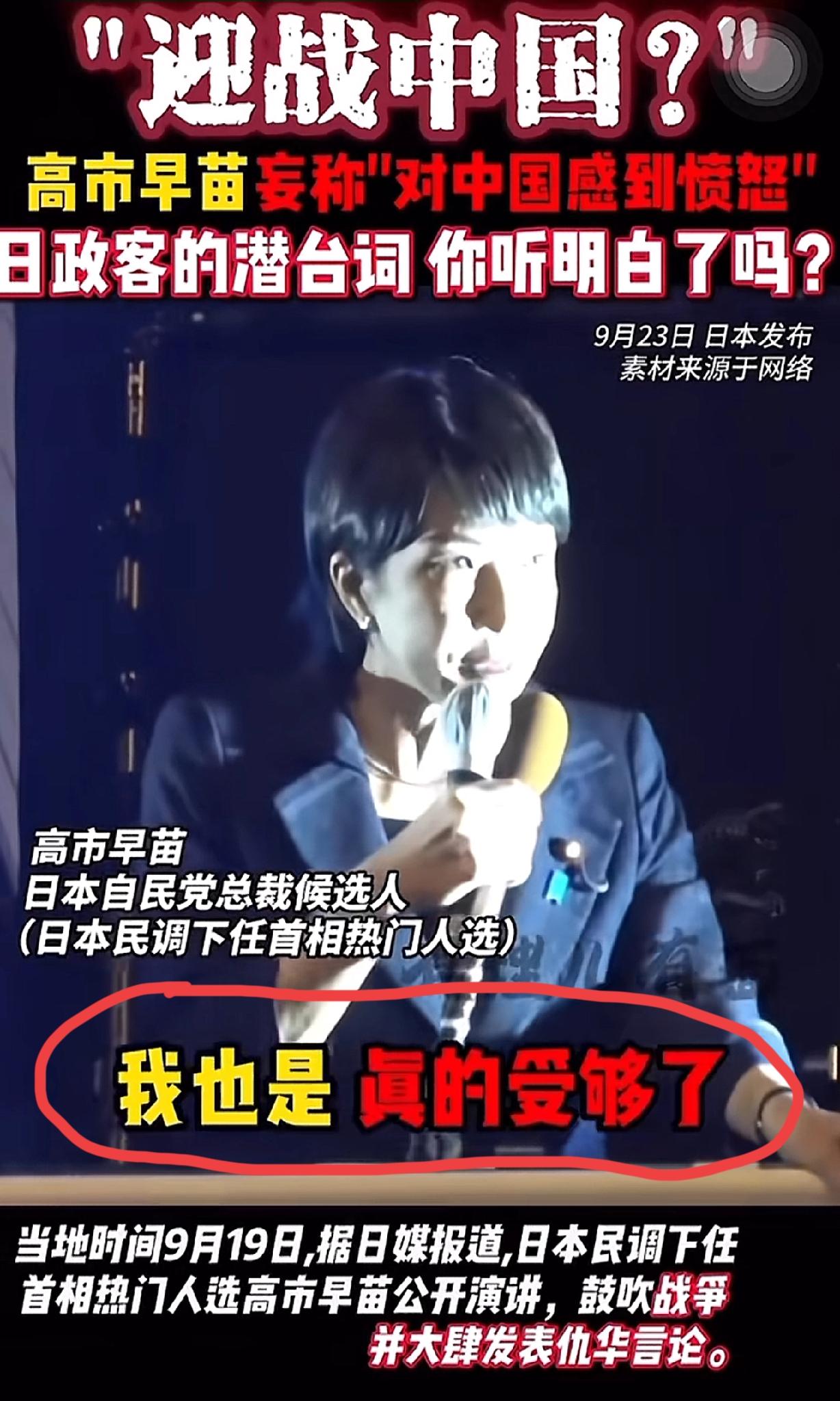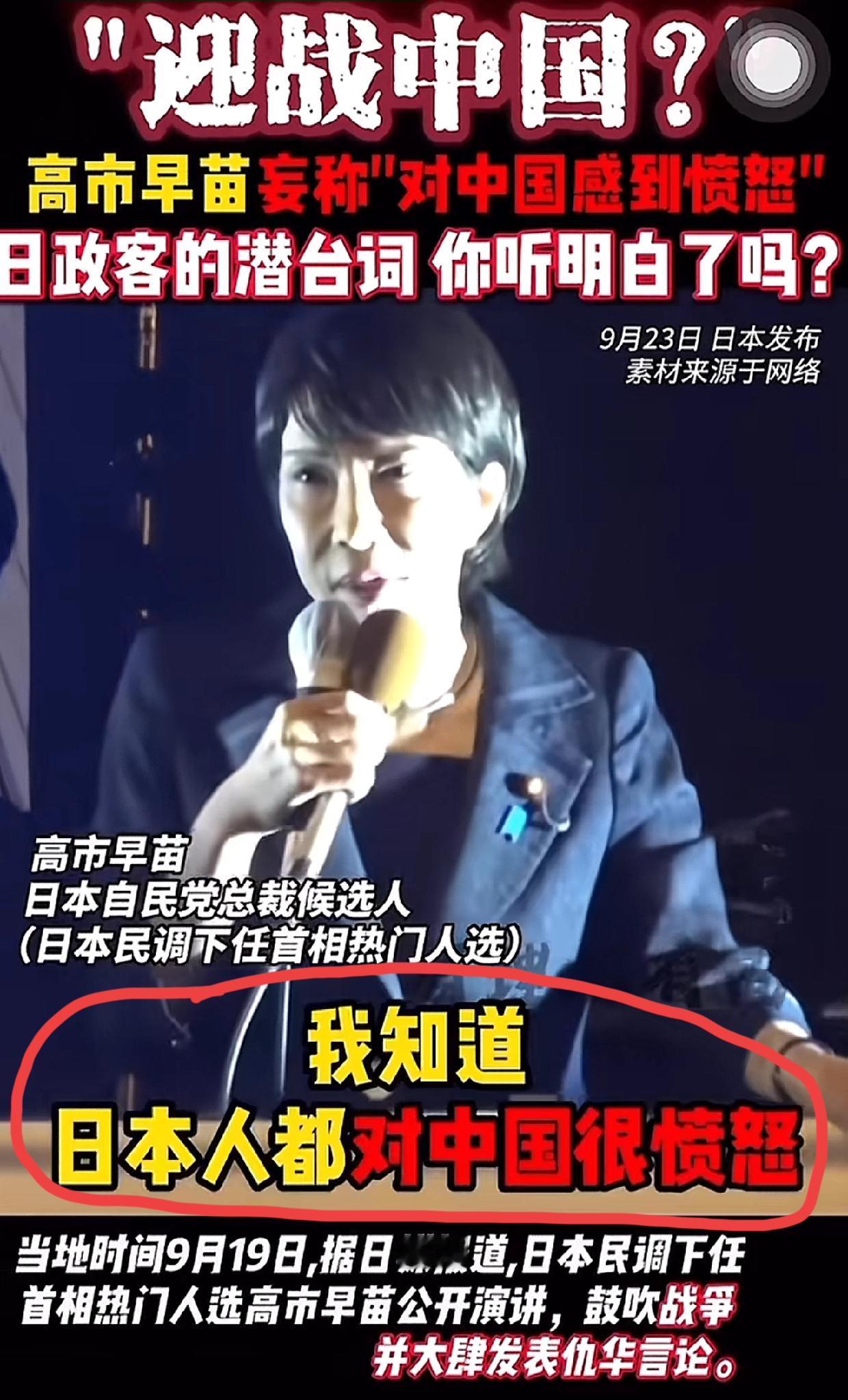 日本女政客高市早苗,真的是个“戏精”[笑哭]!日本头一个女首相估计就她了,这个日本右翼女政客,外号可多了。有人叫她“女版安倍”,“日本撒切尔夫人”。 还有人说他是“日本特朗普”,不过她对咱们的态度,那叫一个大胆。她说“台湾有事就是日本有事”,还想在经济上和咱们脱钩。此人也是参拜靖国神社的常客[6]! 她要把军费提高到GDP的3%,自卫队改成“国防军”。可她竞选的时候,又突然说“中日友好”,这变脸速度,简直是川剧大师了。对于她上台后的“表演”,你是咋看的呢[灵光一闪]? 日本