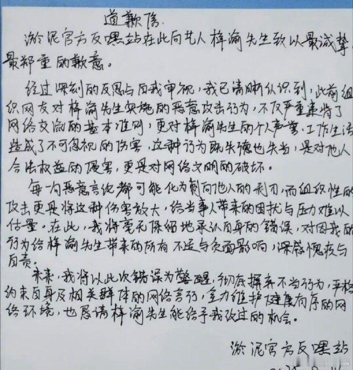 梓渝黑粉写了道歉信梓渝的黑粉手写道歉信向梓渝道歉了,造谣就应受到惩罚,支持告黑和维权!