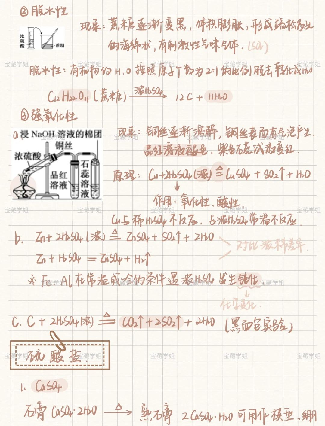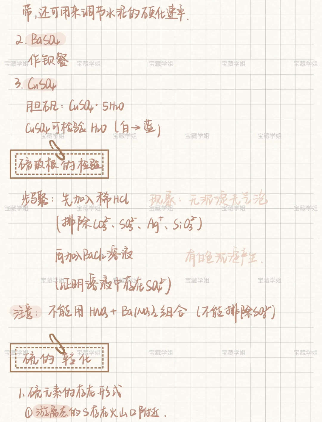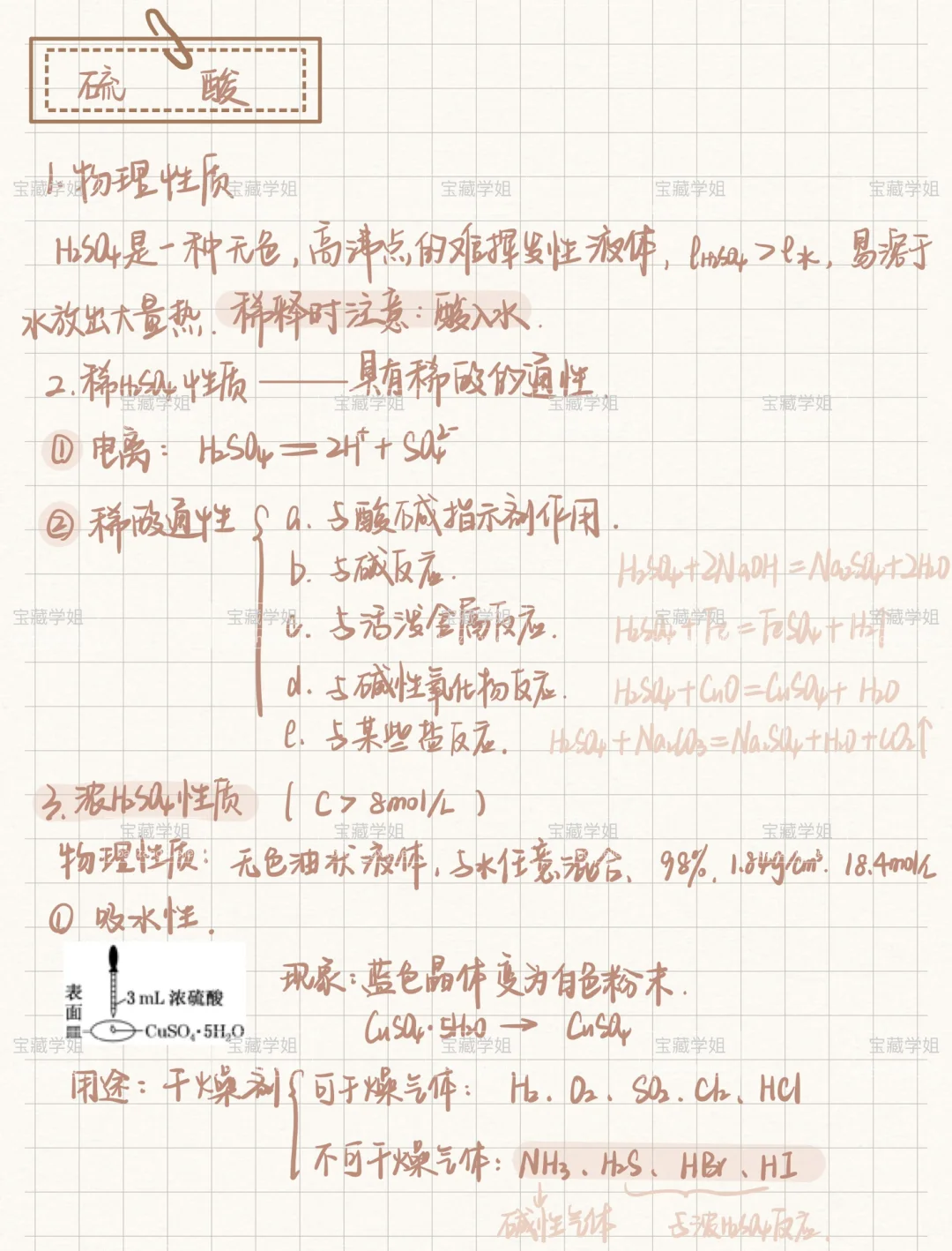 ☃️大家都放假了吧,下学期的化学内容要开始预习起来啦! 📍这篇笔记主要包括硫酸的性质,高中更多考的是浓硫酸的性质(吸水性、脱水性、强氧化性) 如何按照正确顺序去检验硫酸跟离子 🔜下篇笔记会尽快更新